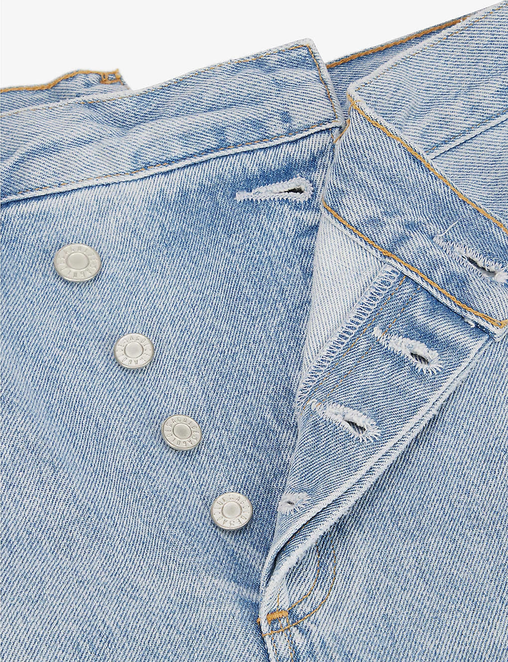 - Regular-fit, straight, high-rise, belt loops, cross-over waistband and asymmetrical button fastening, five pockets, branded silver-toned hardware, faded wash and whiskering, contrast stitching, V-shaped yoke at back, distressed hem