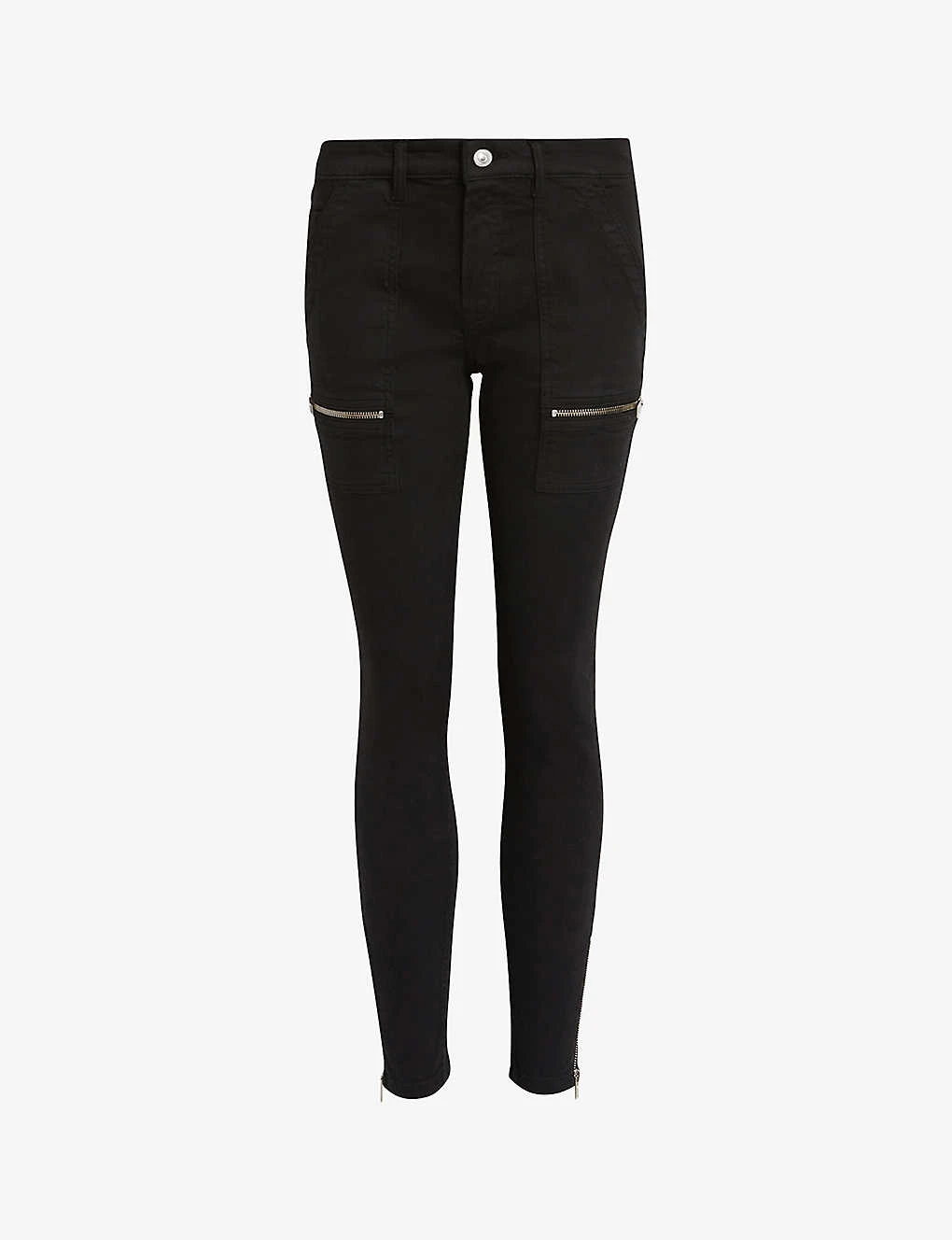 - Skinny leg, mid rise five pockets, two zip pockets at front, all-over tonal stitching, silver-tone hardware