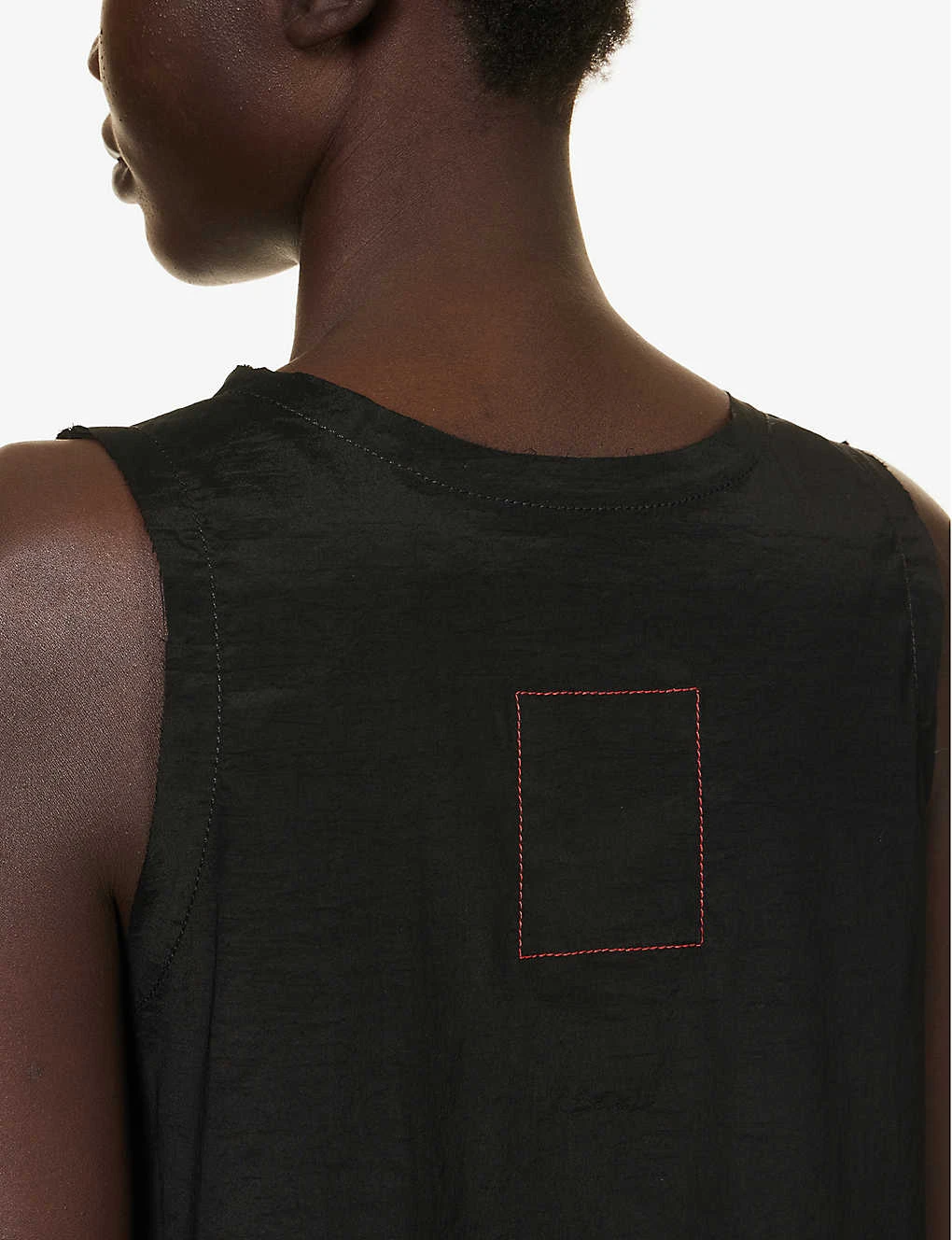 - Regular fit, round neckline, sleeveless, two slip pockets at front, A-line shape, raw trims