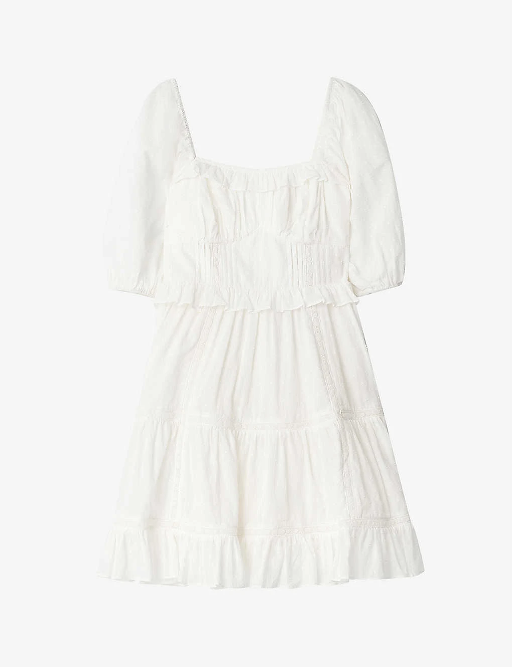 - Shell print, square neckline, frilled trims, tie-detail on back, tiered skirt