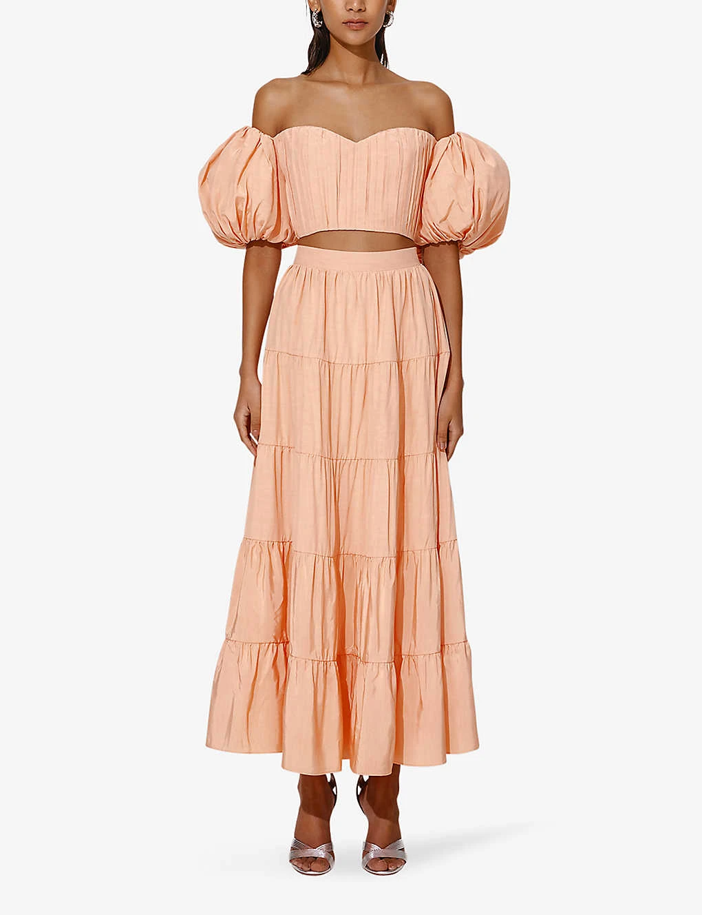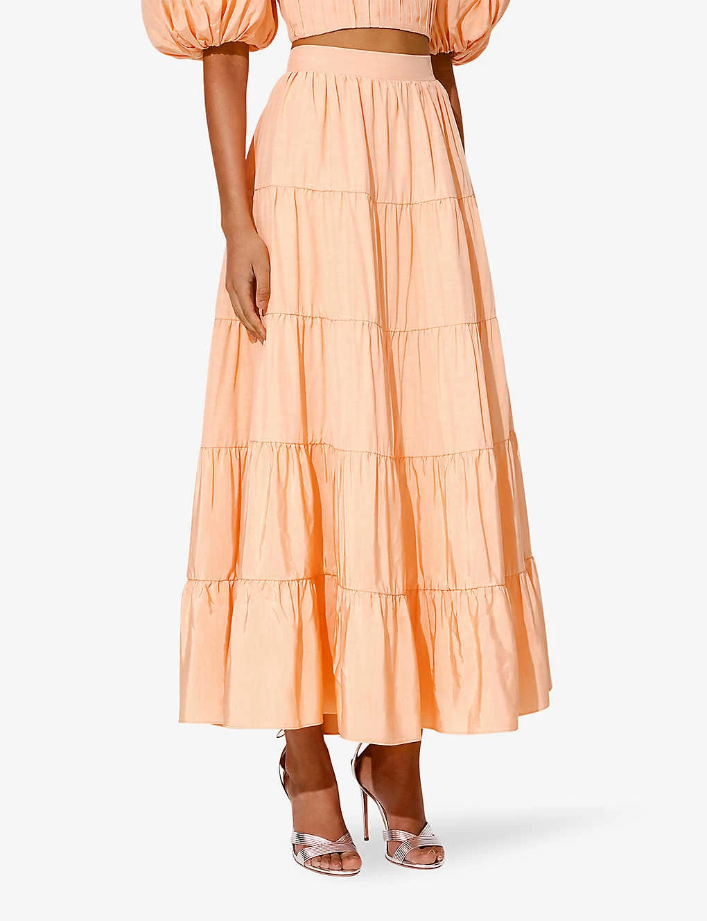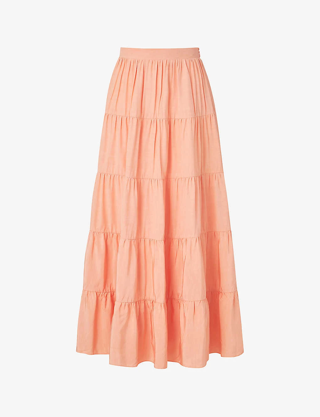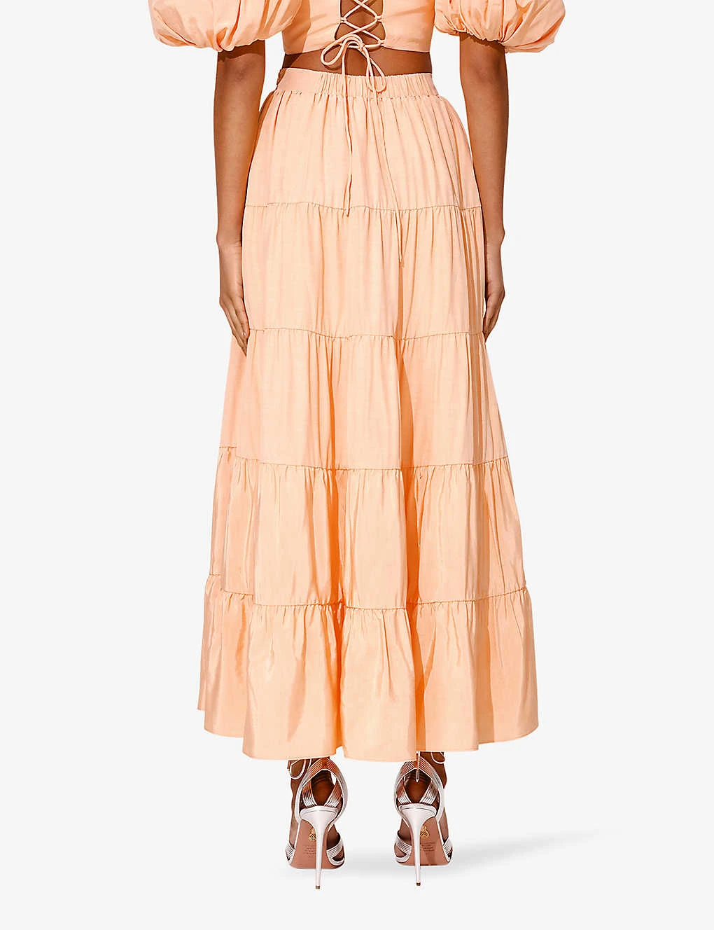 - High-rise, maxi length, structured waistband, pleated, tiered-hem