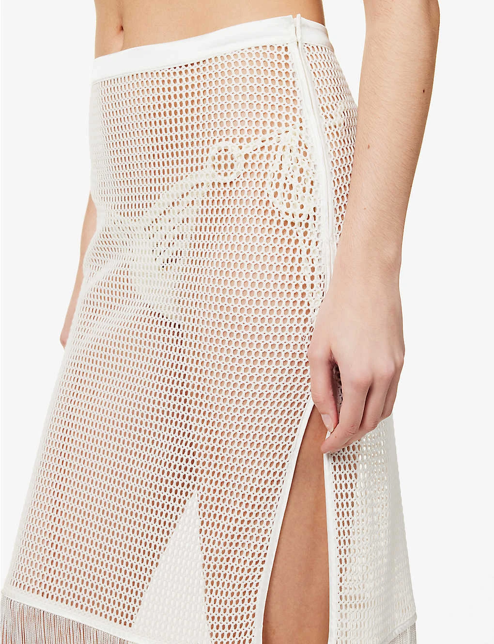 - Regular-fit, high-waist, elasticated waistband, all-over perforated knit, satin trims, split sides, fringing at hem