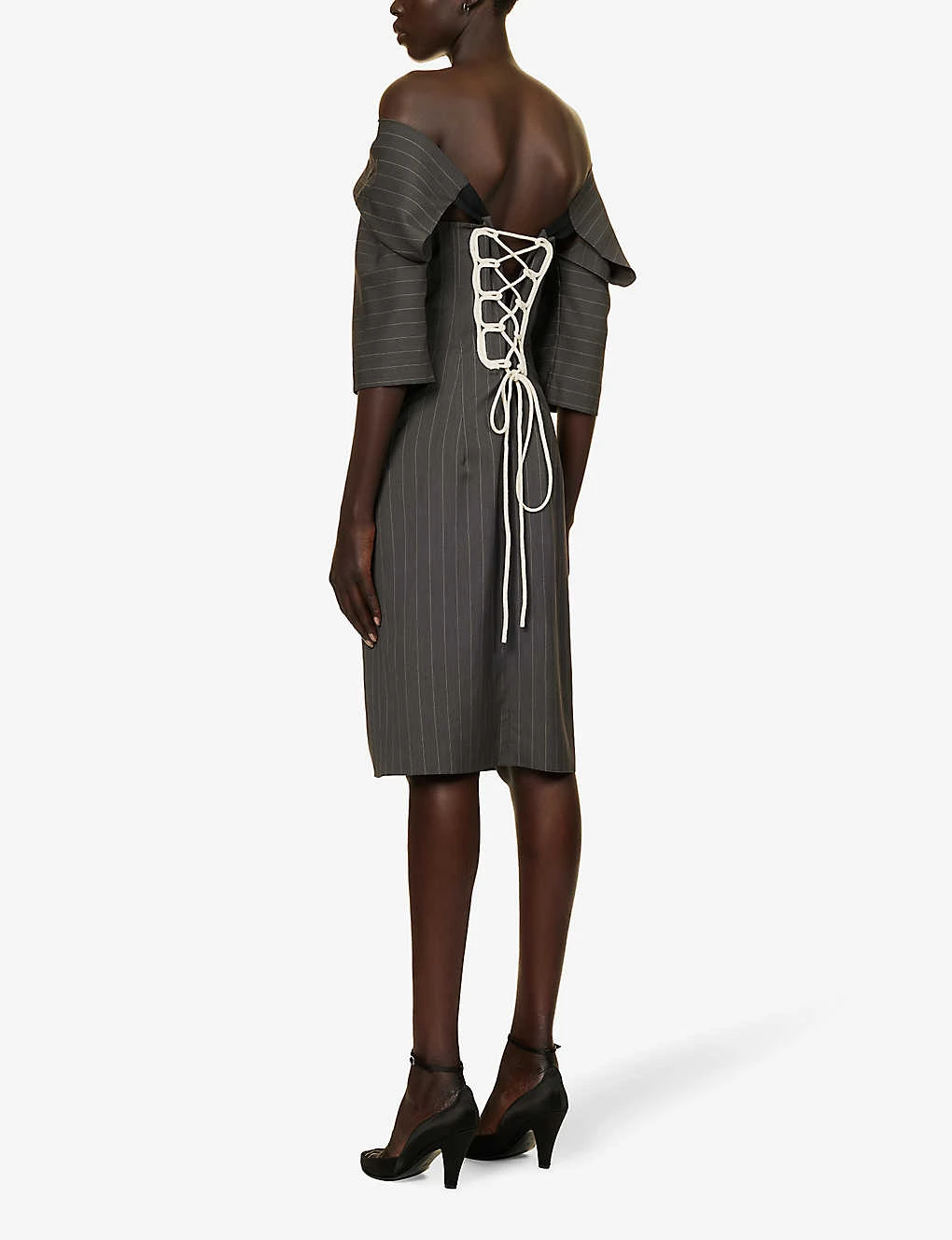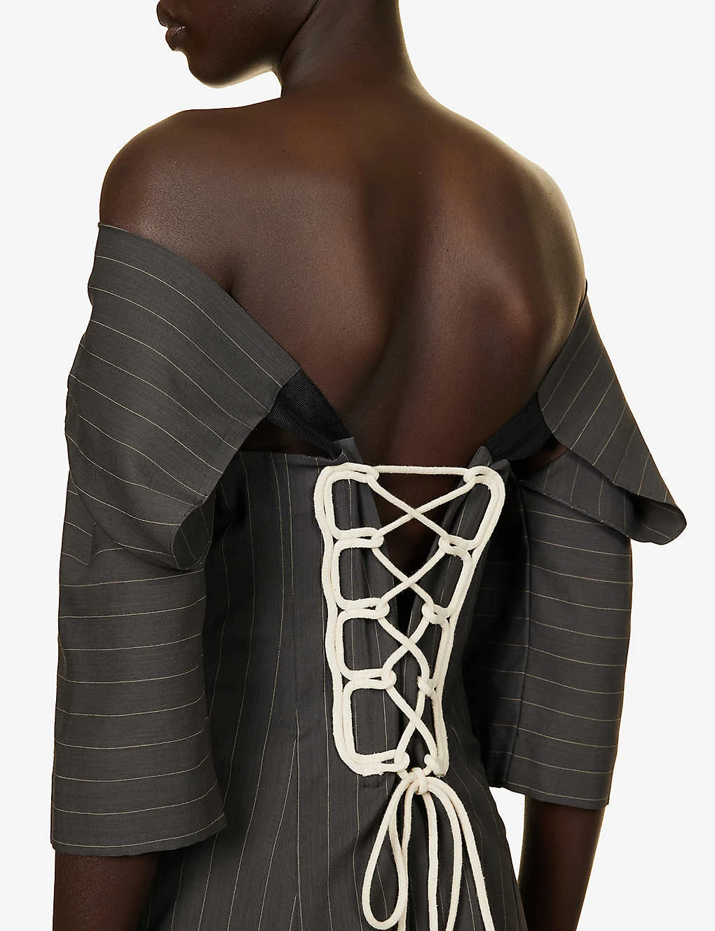 - Regular fit, V-neckline, short sleeves, cut-out panels at back, contrast self-tie at back, corset boning, all-over stripe pattern, flared hem