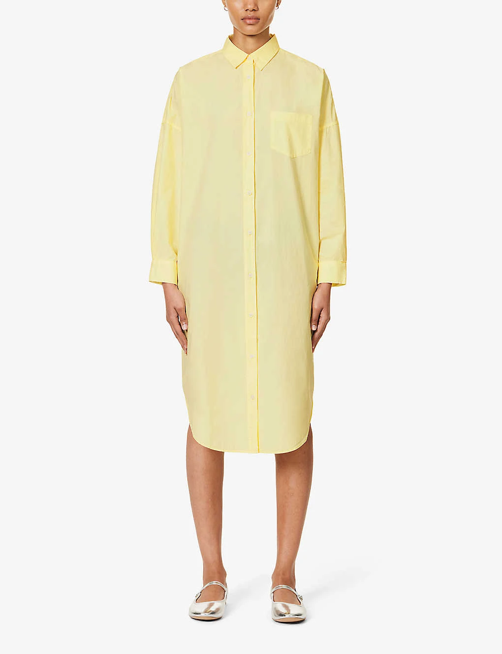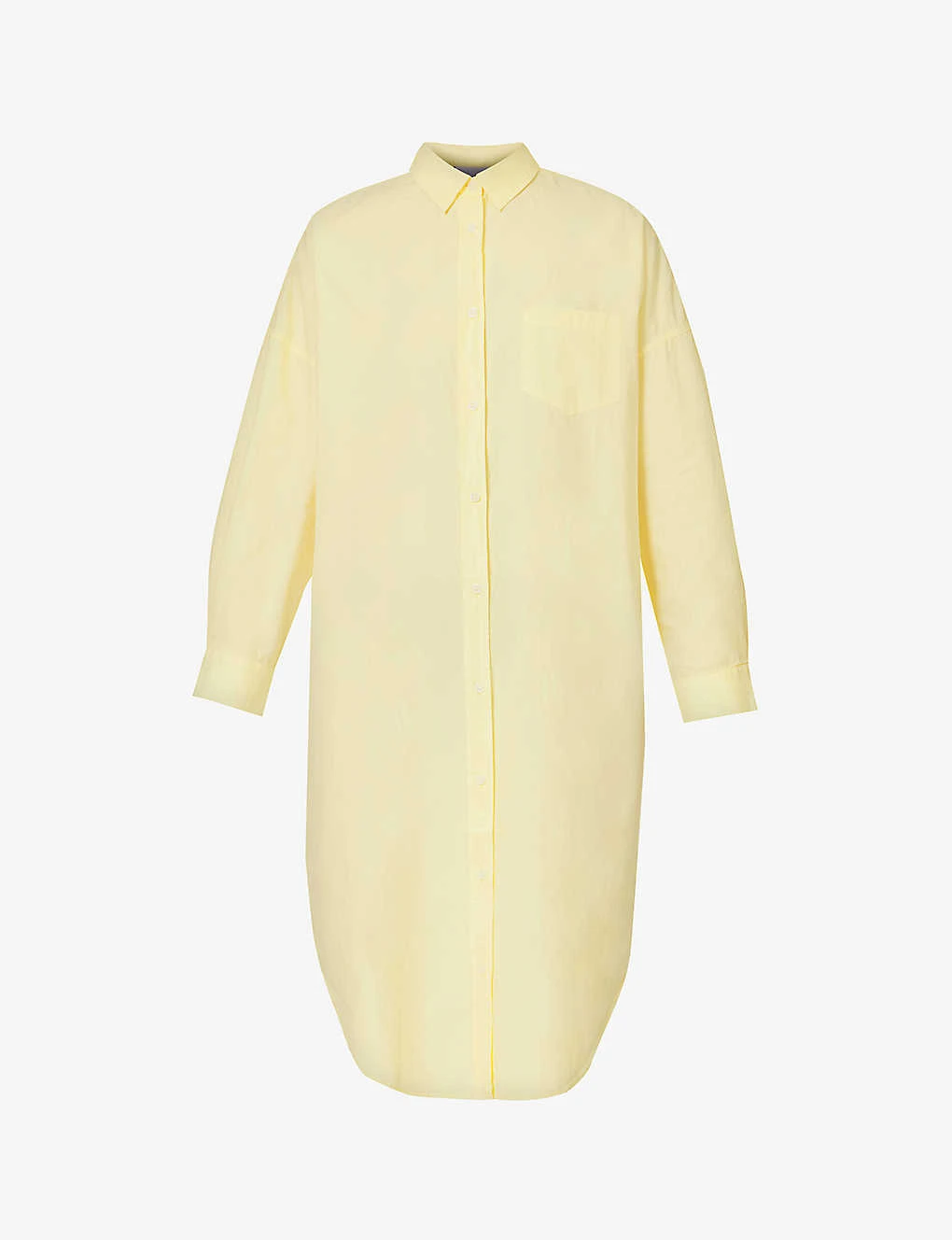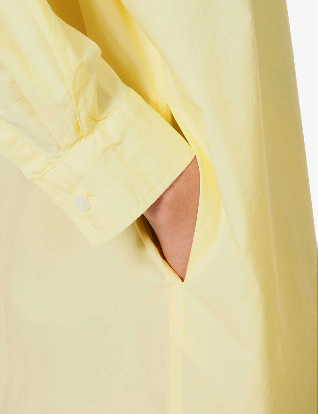 - Relaxed fit, collar, dropped shoulders, long sleeves, pleated buttoned cuffs, patch pocket at chest, box pleat at back, pearlescent buttons, dipped hem at back