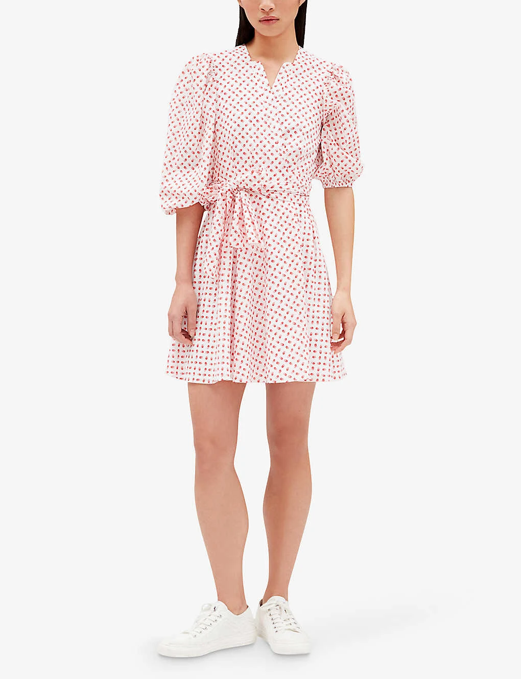 - V neckline, puff sleeves, floral-print throughout, flared skirt, self-tie belt at the waist, mini silhouette