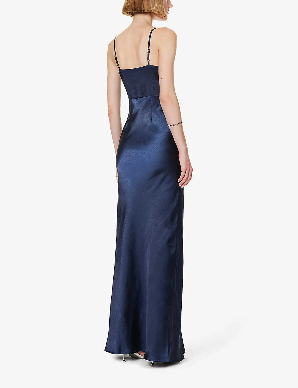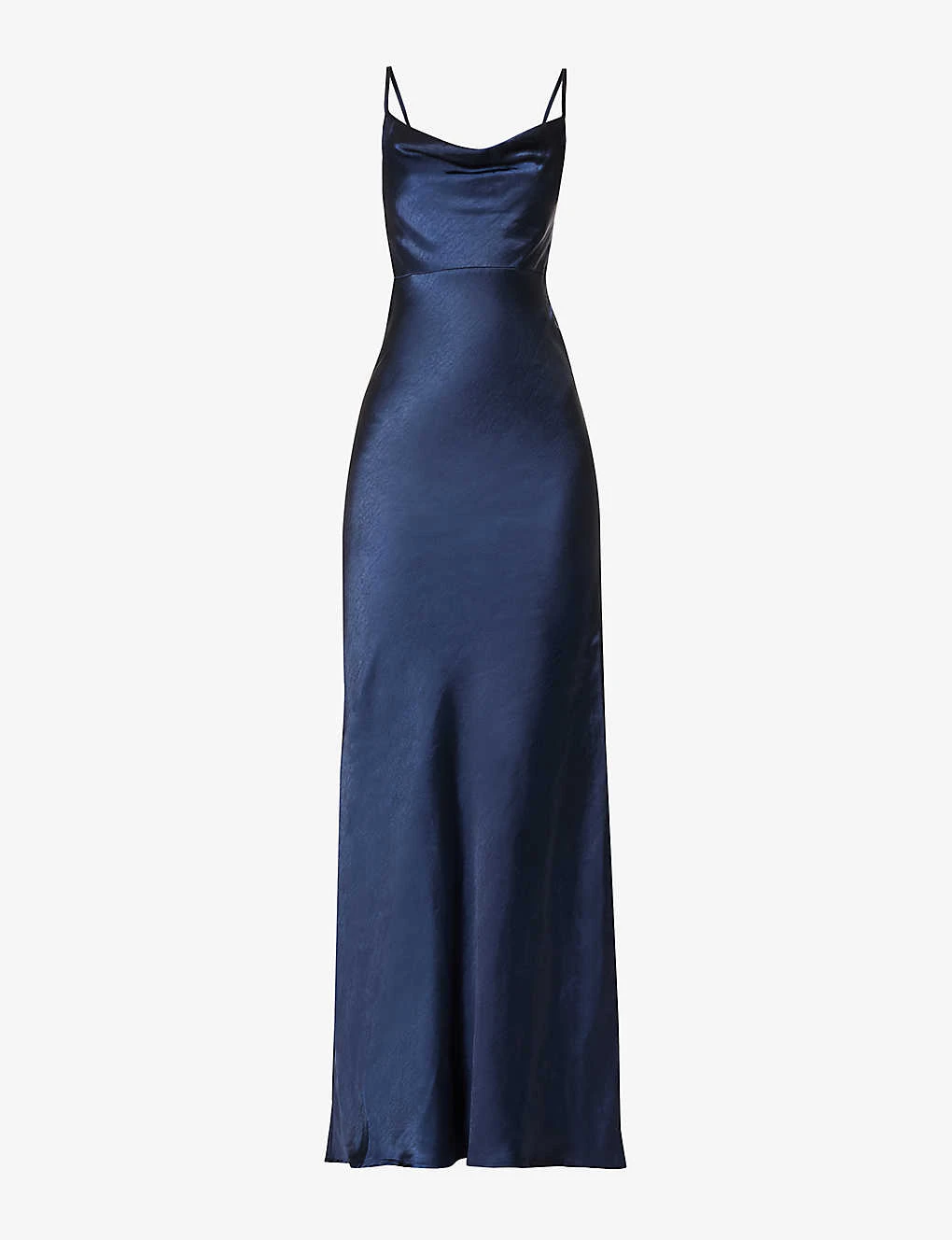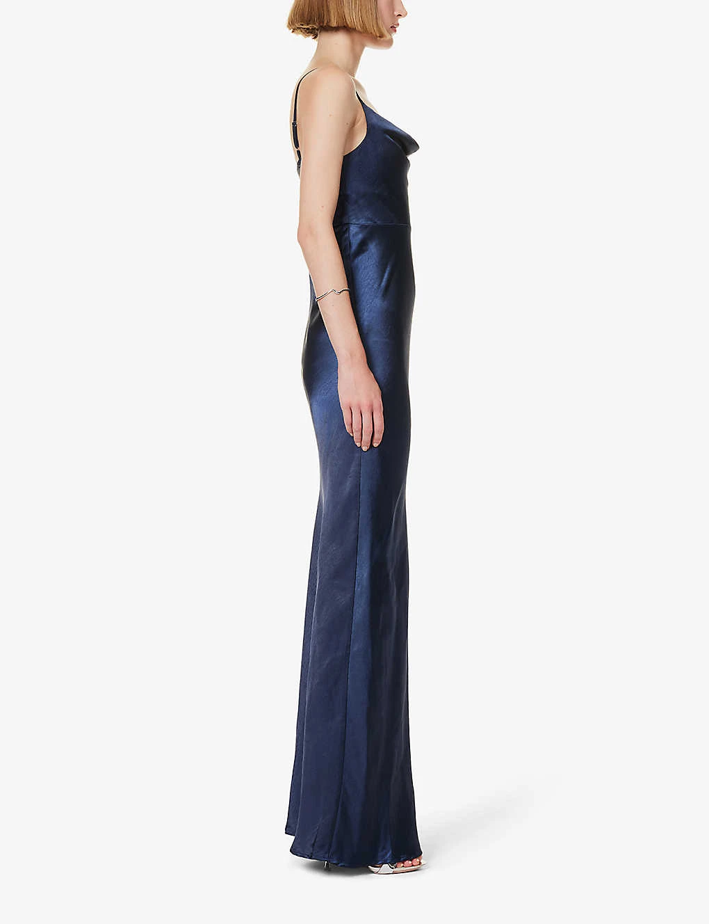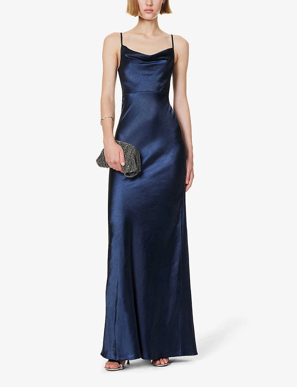 - Slim fit, cowl neckline, adjustable shoulder straps, high waist, darts at front, all over satin texture, flared hem