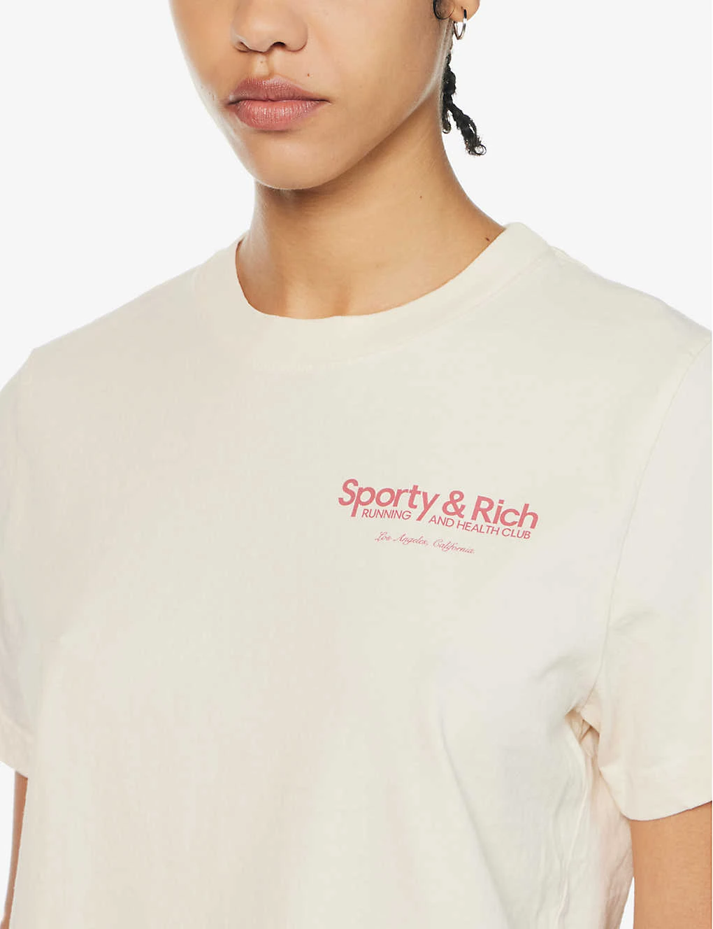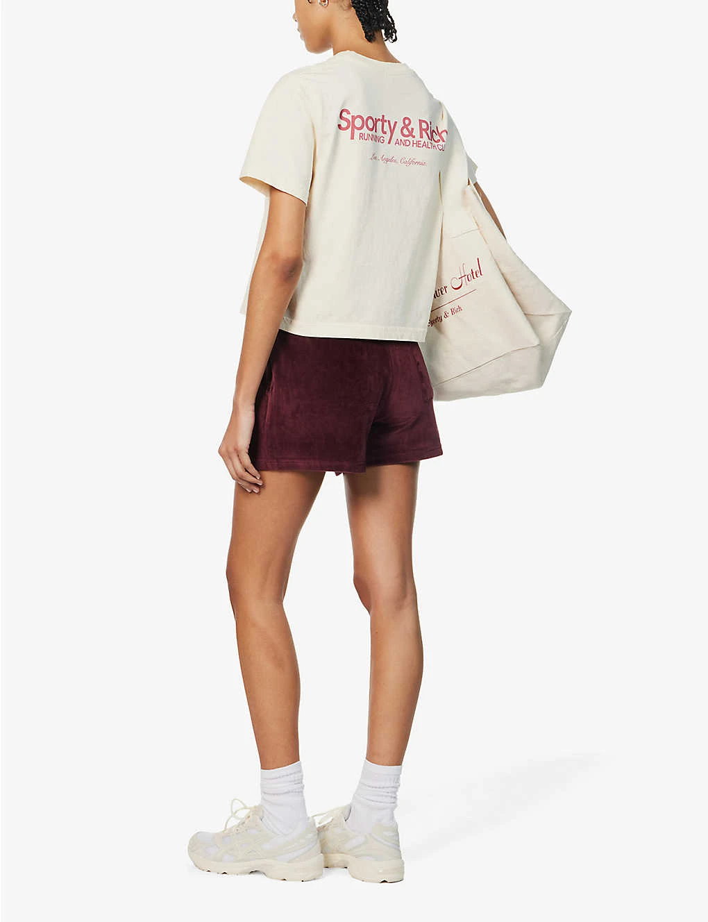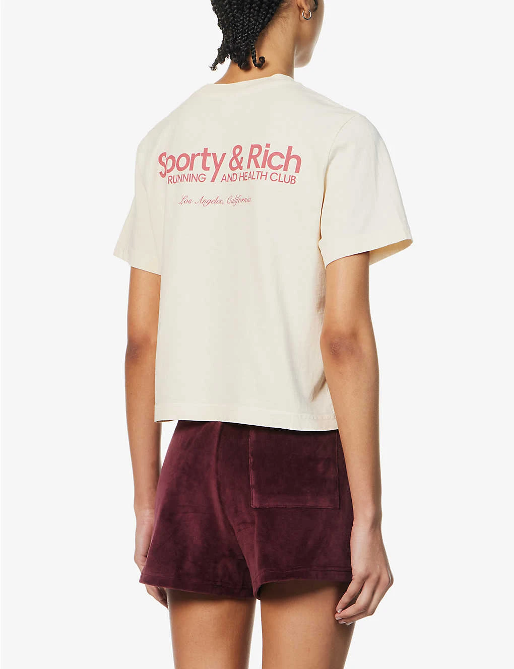 - Boxy fit, cropped, round neck, ribbed trim at neck, short sleeves, branded print at chest and back