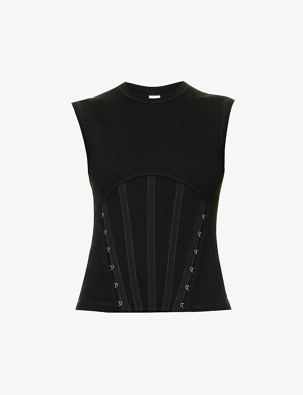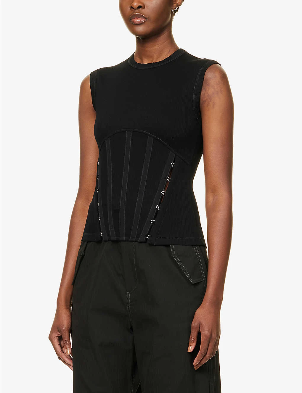 - Slim fit, round neck, sleeveless, detachable corset panel at front, all-over ribbed texture