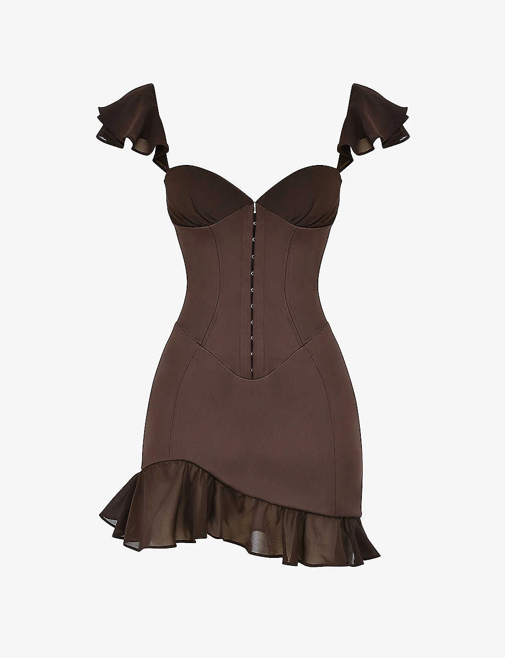 - Slim fit, sweetheart neck, sleeveless, frilled shoulder straps, structured bodice, semi-sheer, gathered hem, fully lined