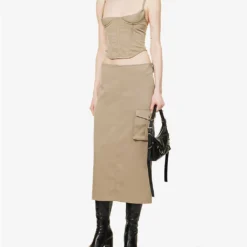 - Regular fit, mid-rise, structured waistband with belt loops, two slip pockets at front, two flap pockets at sides, darts at back, branded silver-toned hardware