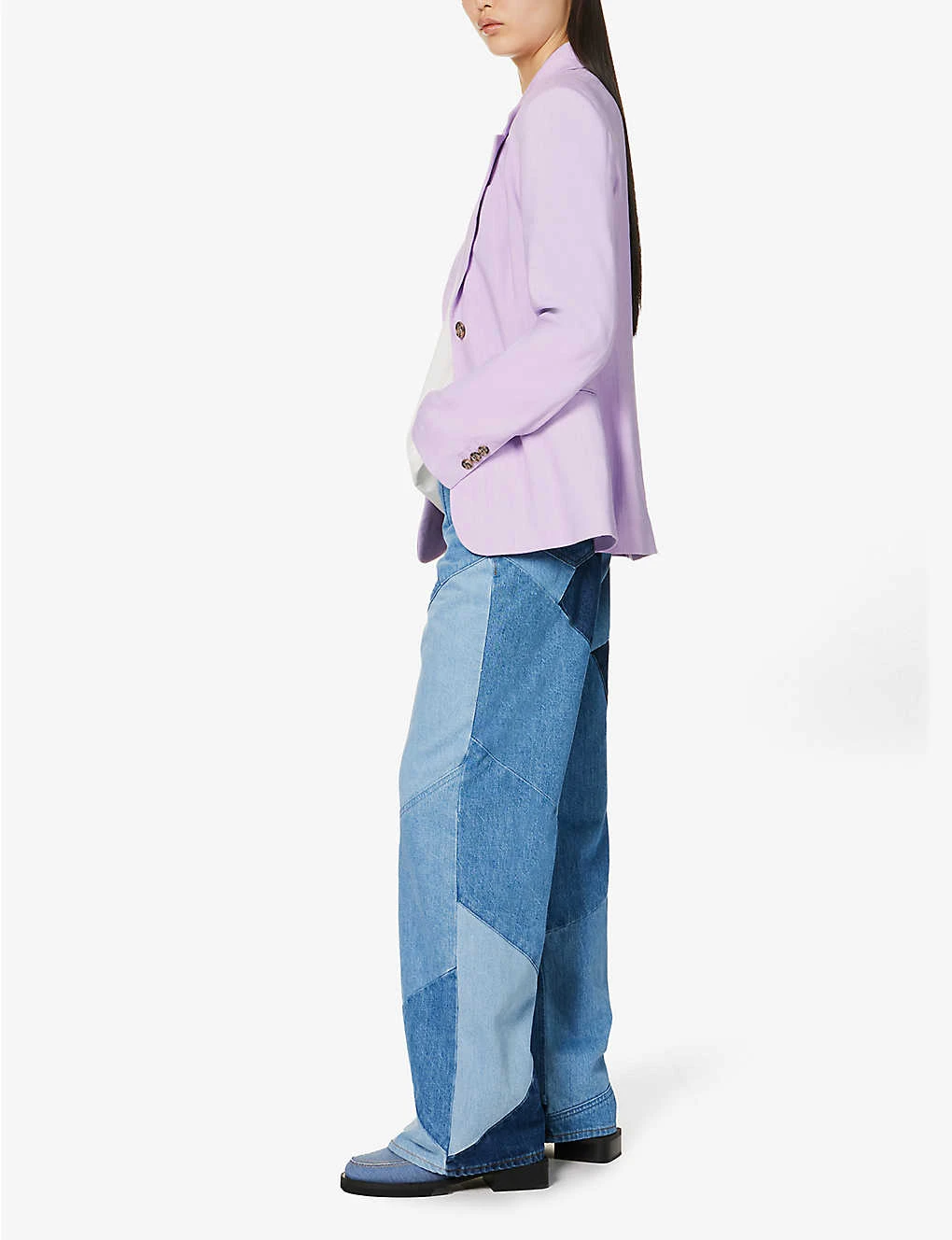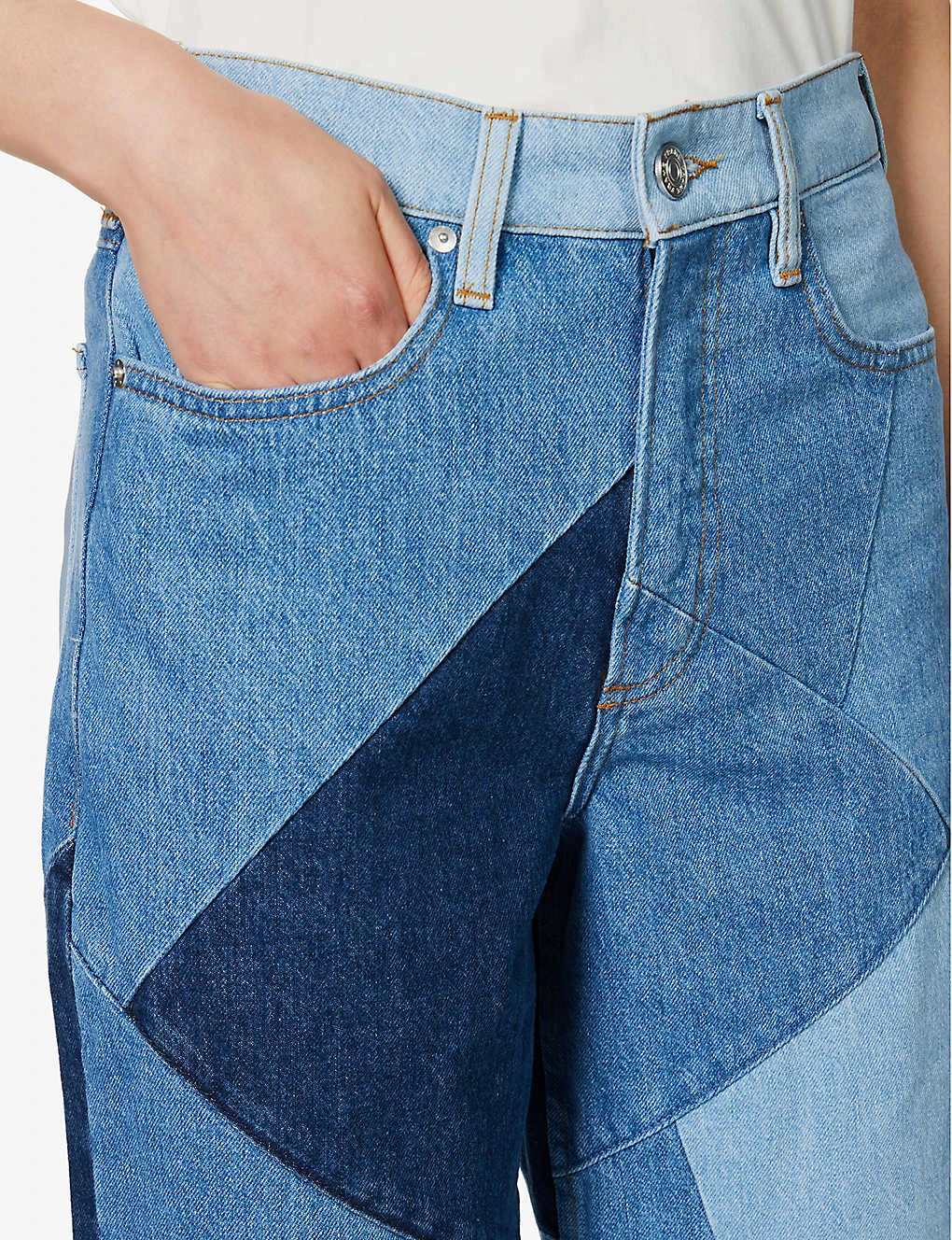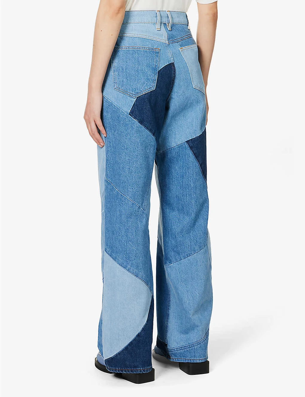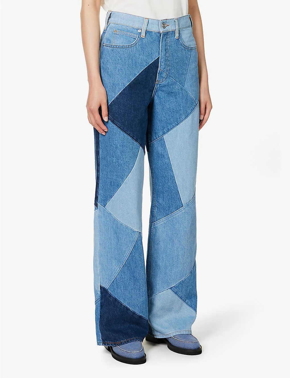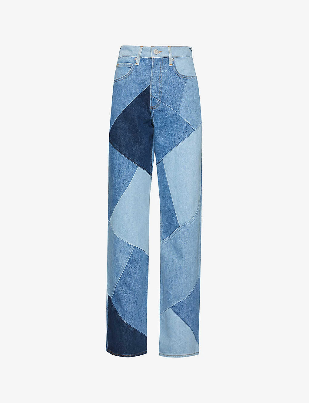 - Relaxed fit, high rise, wide leg, belt loops, five pockets, brand patch at back, all over patchwork, straight cuffs