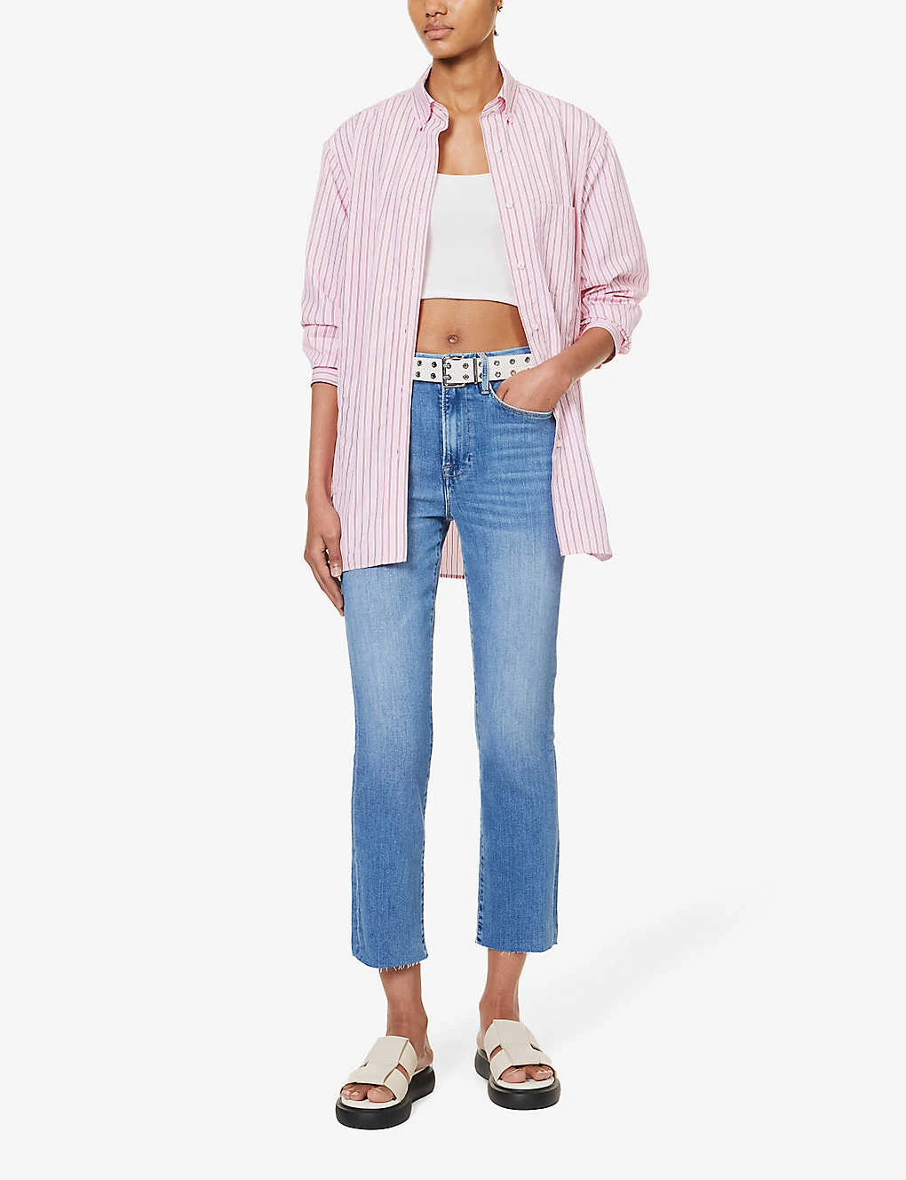 - Slim fit, high rise, straight leg, structured waistband with belt loops, five pockets, curved yoke at back, mid-faded wash, contrast stitching, branded silver-toned hardware, raw hems
