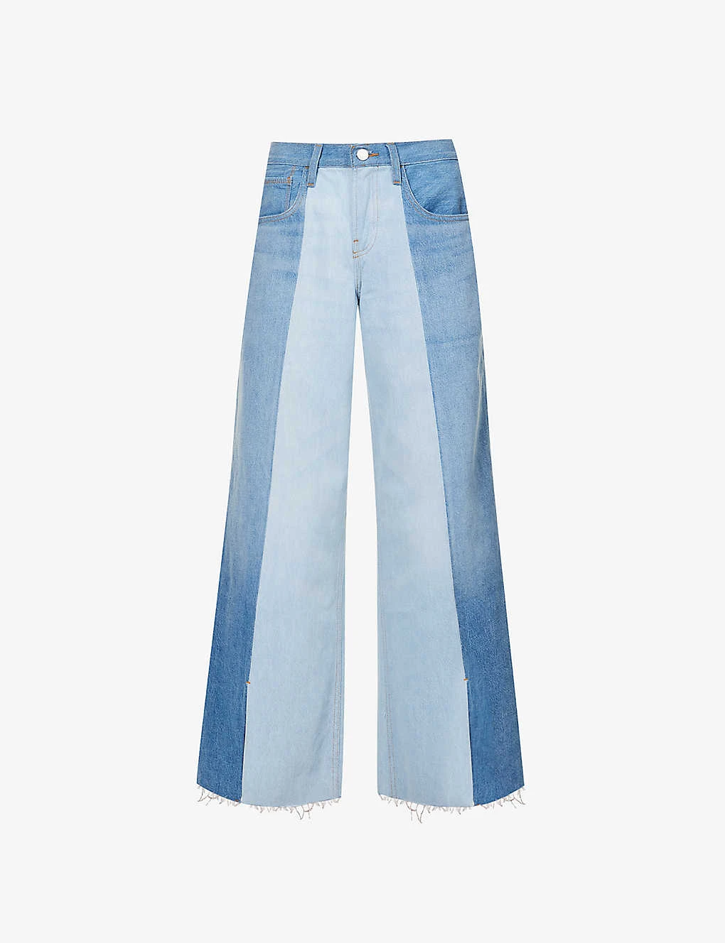 - Regular fit, mid-rise, wide leg, structured waistband with belt loops, five pockets, curved yoke at back, contrast stitching, panelled pattern, two-toned wash, split hems, raw trim at hem, branded silver-toned hardware