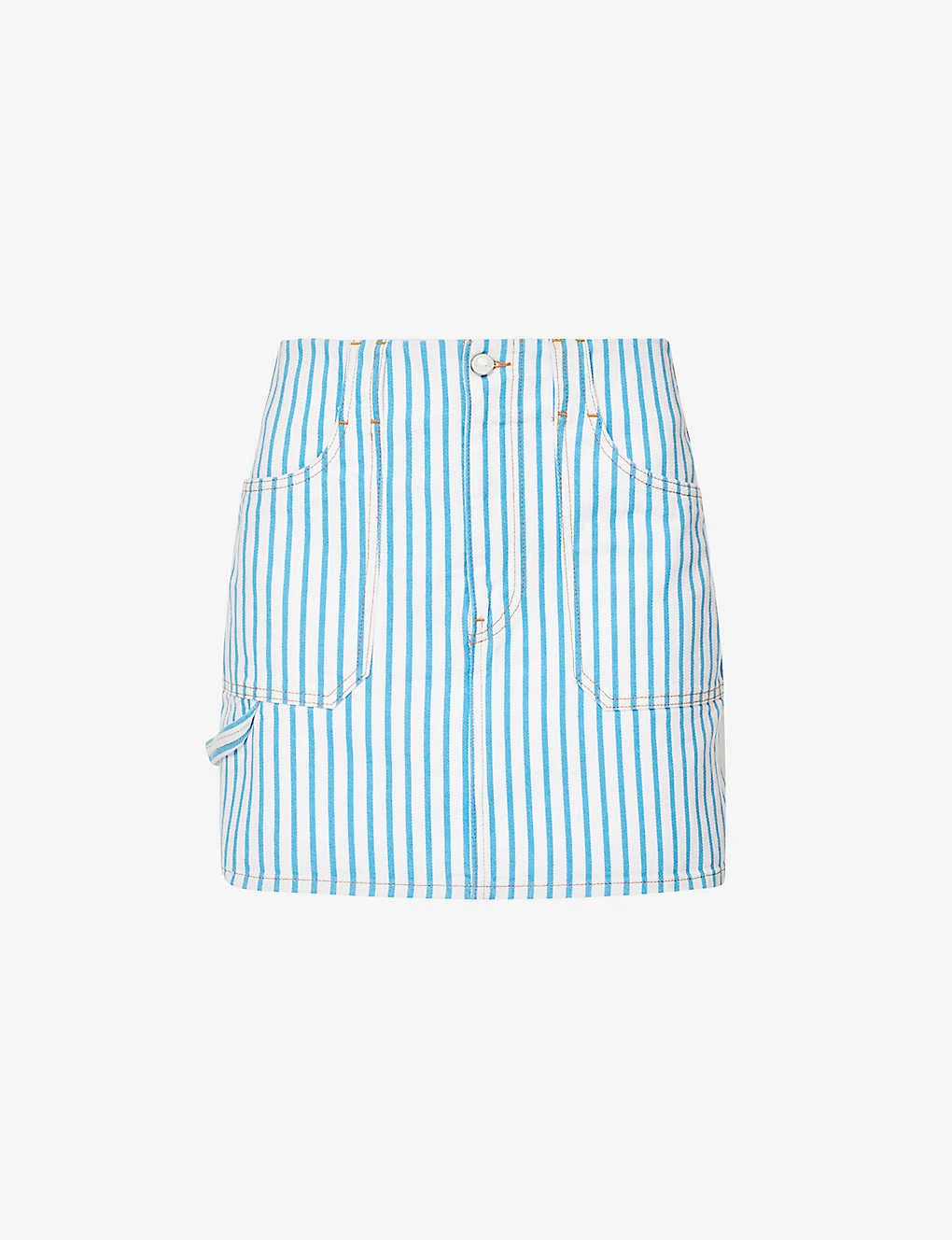 - A-line silhouette, high waist, belt loops, two slip pockets at front, hammer-loop at side, two patch pockets at back, brand patch at back, slip pocket at back, branded hardware, all-over striped pattern