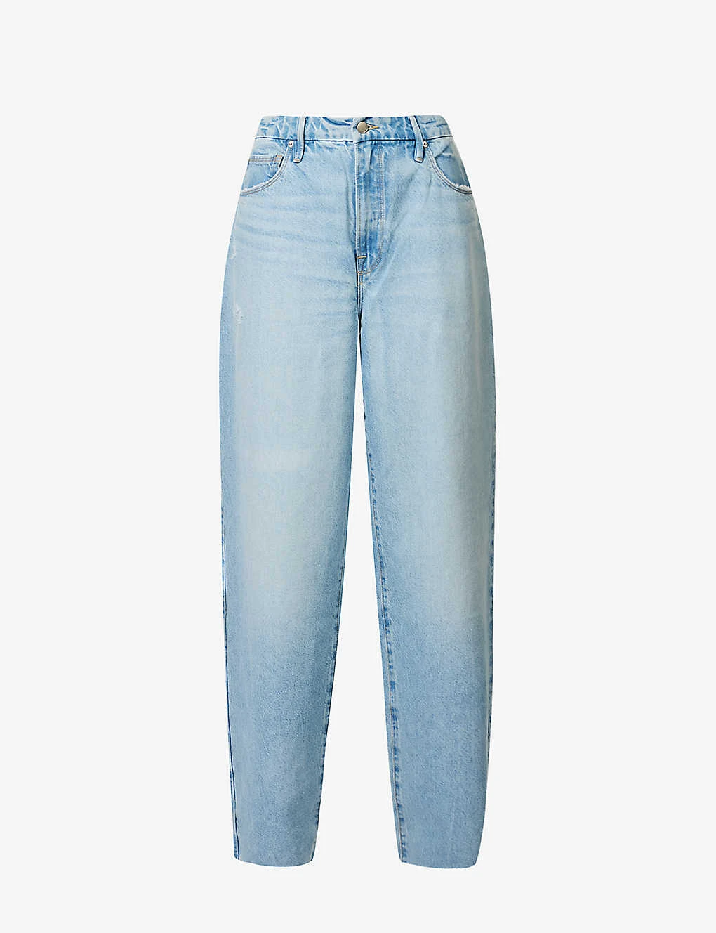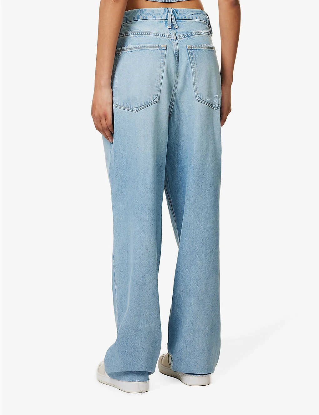- Relaxed fit, mid-rise, wide leg, structured waistband with belt loops, five pockets, curved yoke at back, faded wash, contrast stitching, distressed patches and trims, silver-toned hardware, raw hems