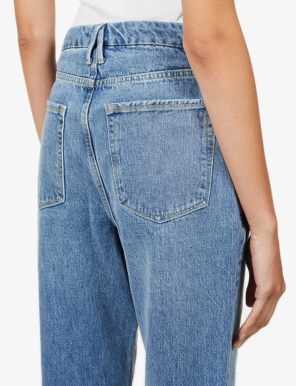 - Relaxed fit, high rise, tapered leg, belt loops, five pockets, contrast stitching, all-over faded wash, split hem
