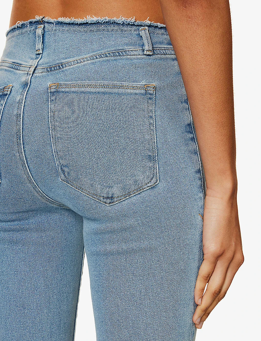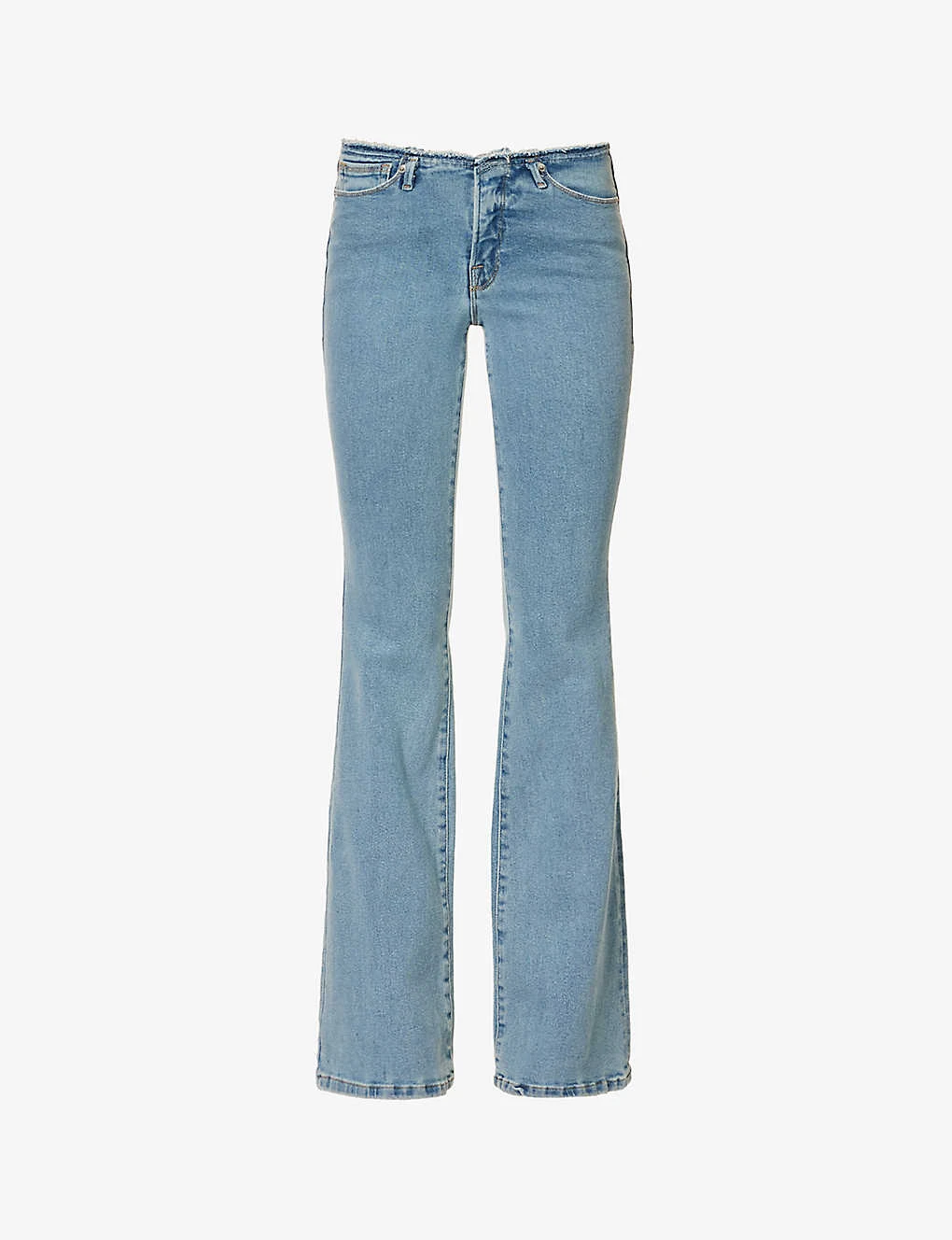 - Slim fit, low-rise, flared leg, raw waistband, five pockets, contrast stitching, faded wash