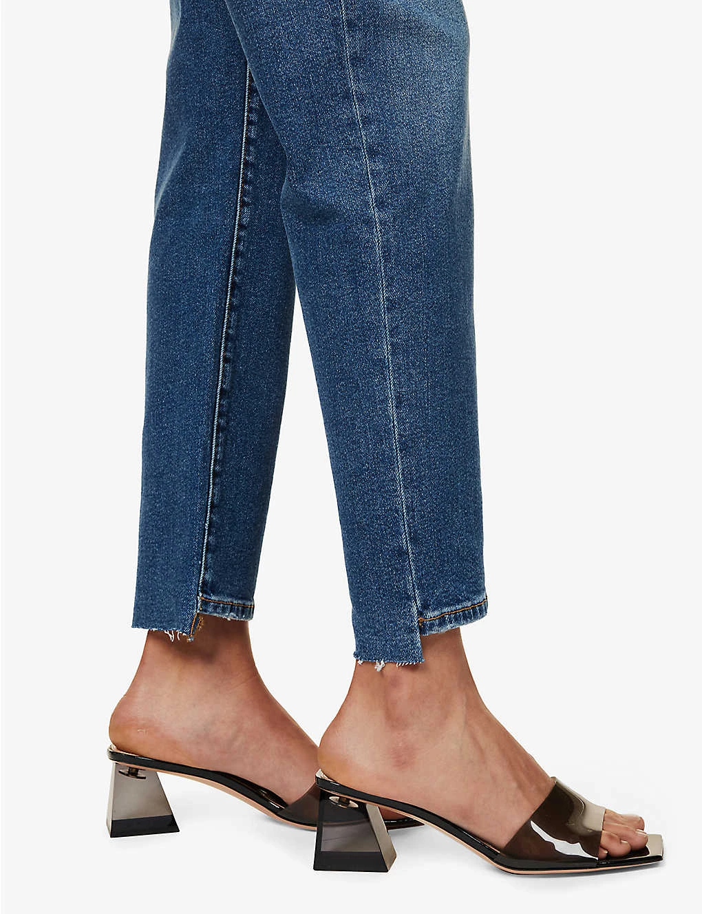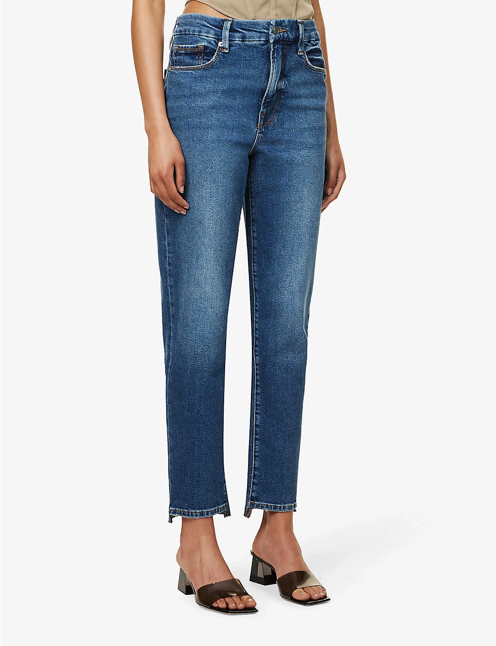 - Regular fit, mid-rise, straight leg, structured waistband with belt loops, five pockets, curved yoke at back, mid-wash, contrast stitching, asymmetric distressed hems, silver-toned hardware