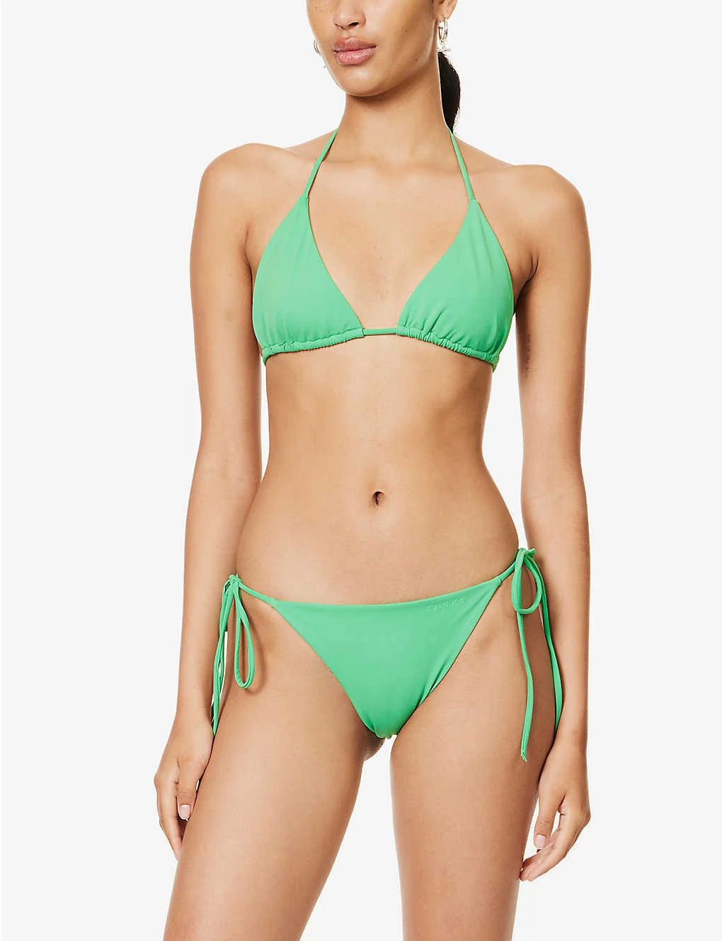 - Triangle cups, halter self-tie, tonal brand text print at front, open strappy back