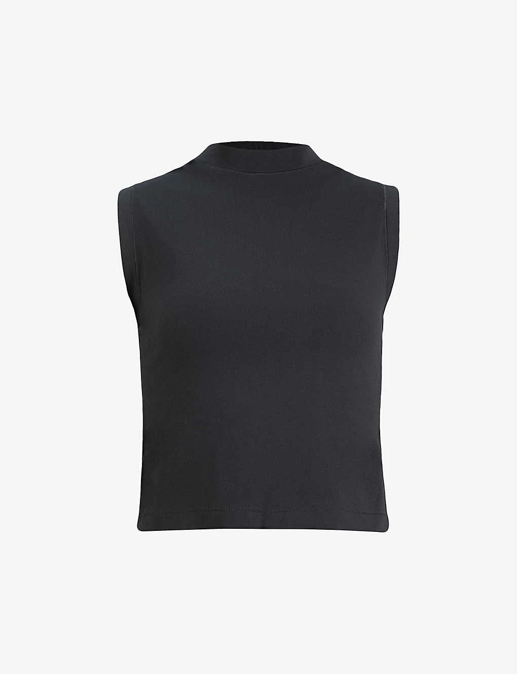 - High neck, sleeveless, loose-fit, ribbed trims, exposed seams, tonal stitching