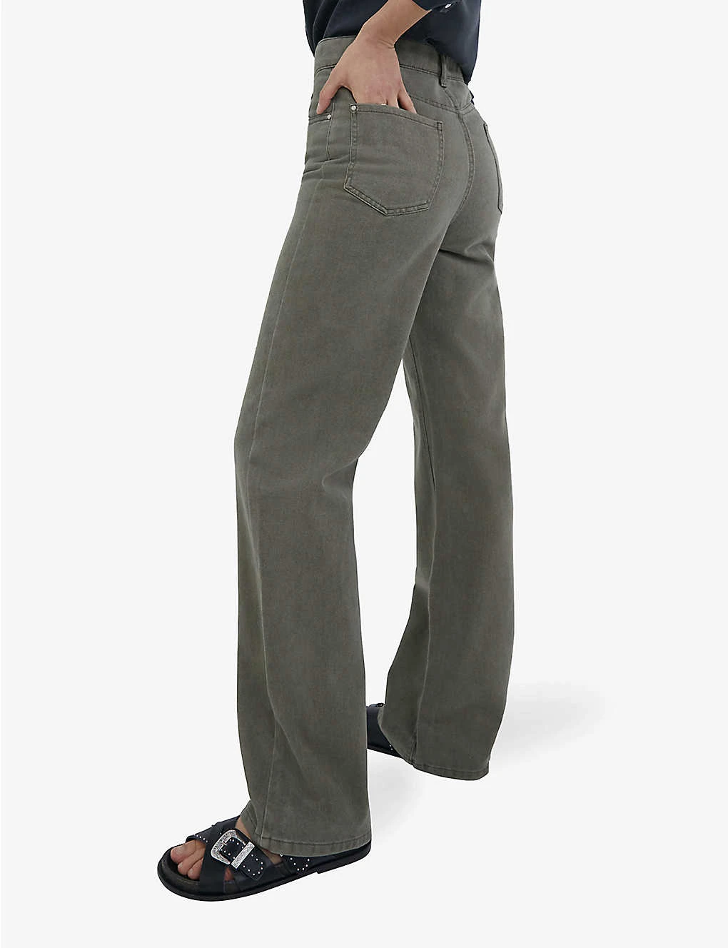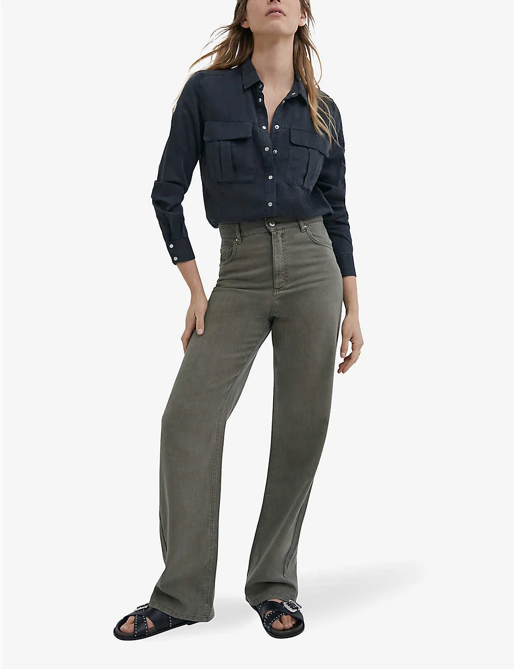 - Structured waistband, belt-loops, high rise, wide leg, distressed at top, two slip pockets at front, one coin pocket at front, metallic studs at front, two patch pockets at back, metallic studs at back, long length hems