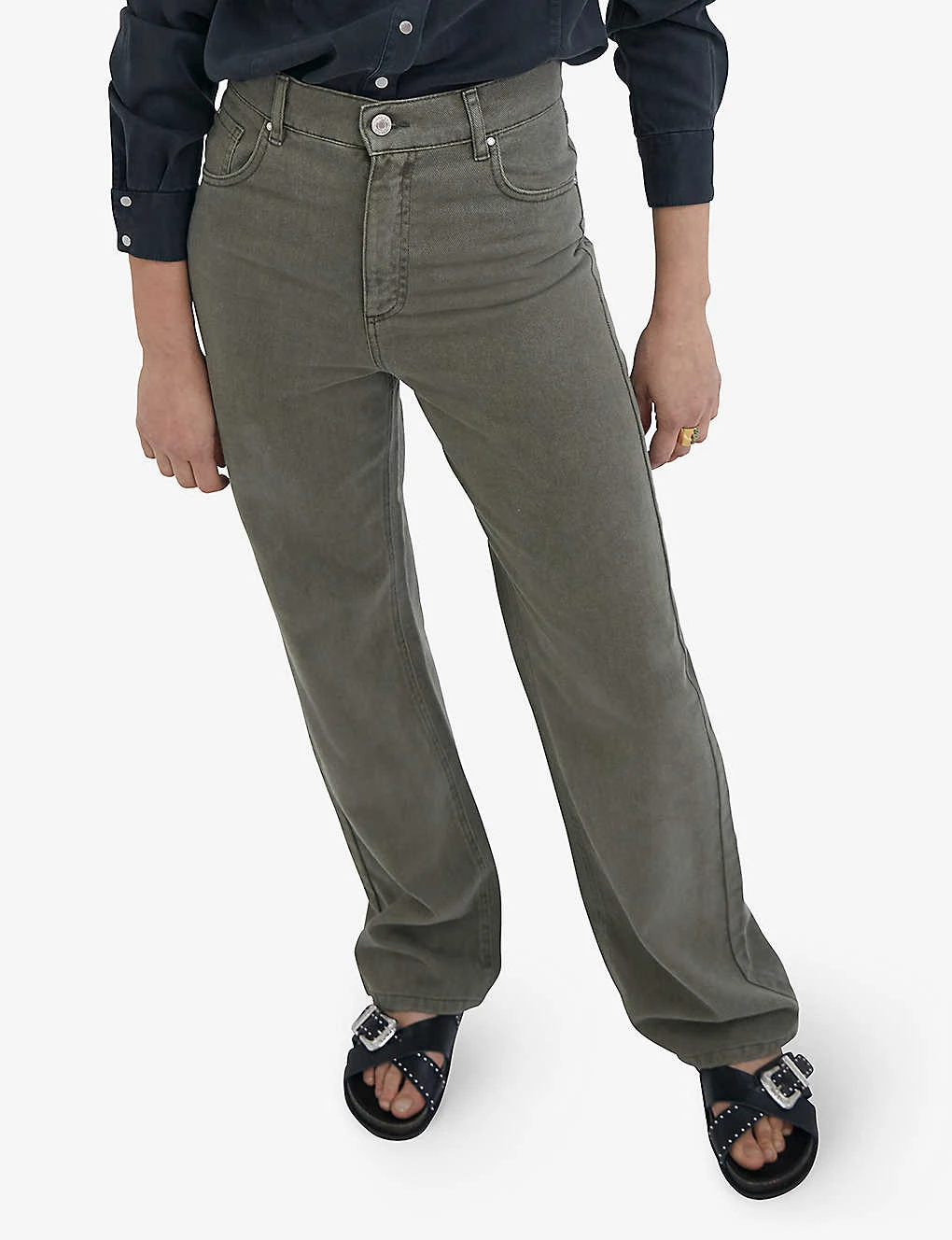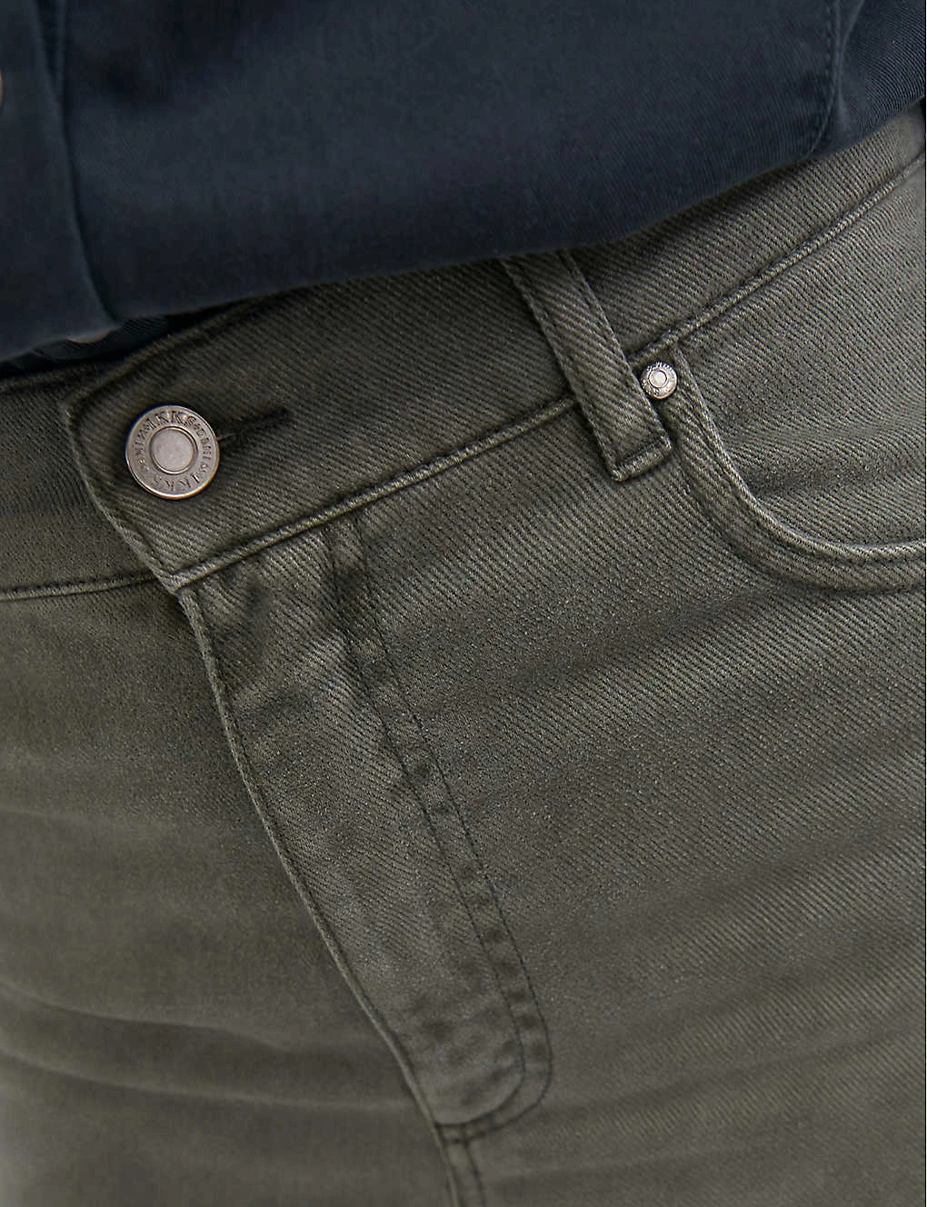 - Exposed button and concealed zip-fly fastening at front