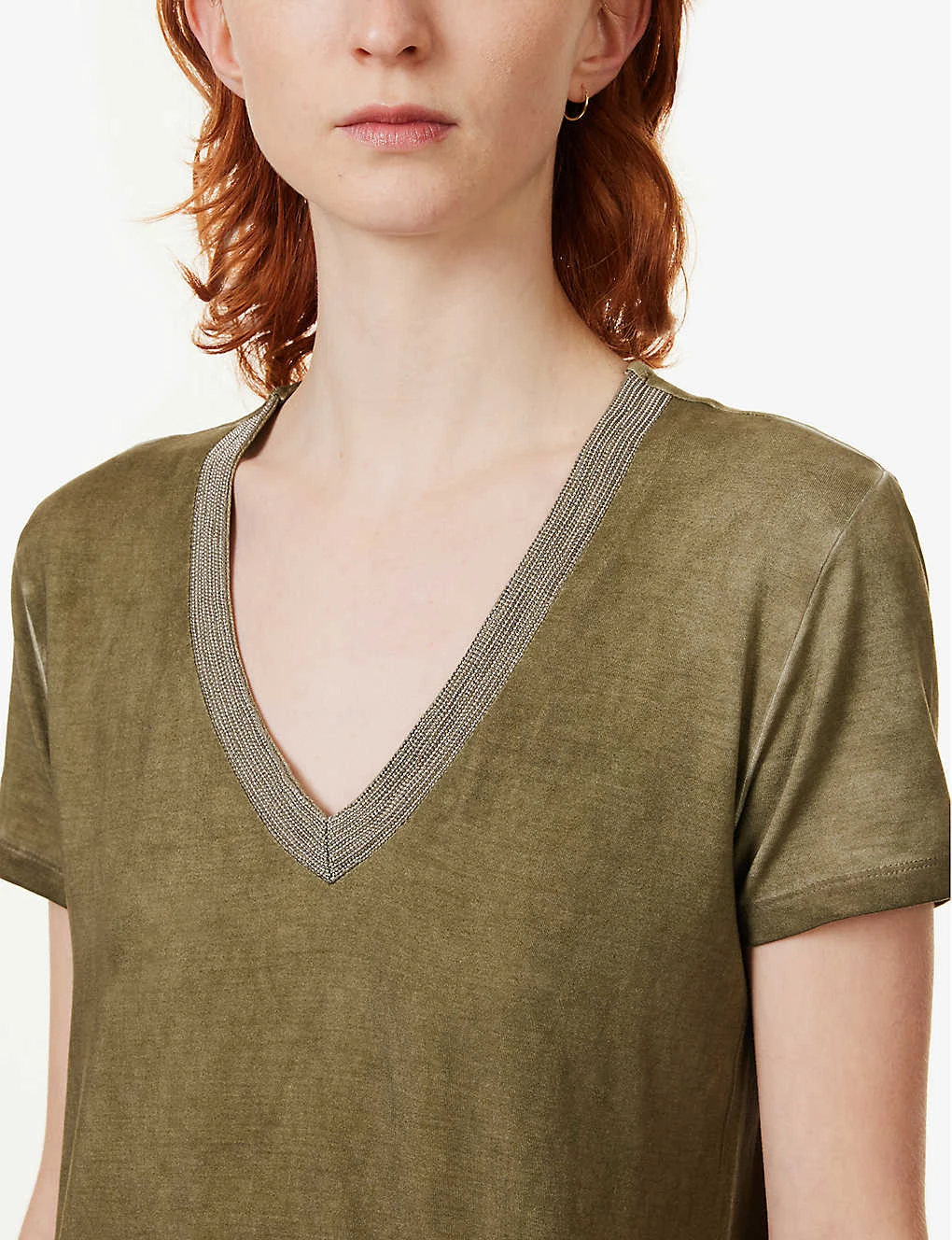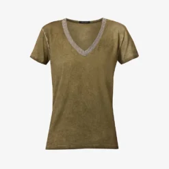 - Relaxed fit, V-neck, embellishment on neckline, short sleeves, faded wash