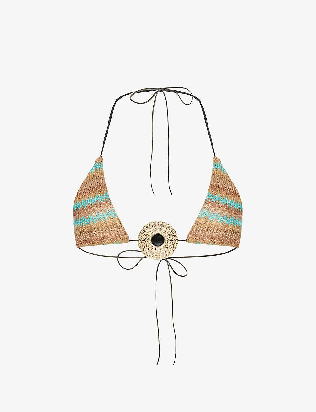 - Halter-neck, triangle cups, gold-toned disc embellishment at centre, all-over striped zigzag knit, lined