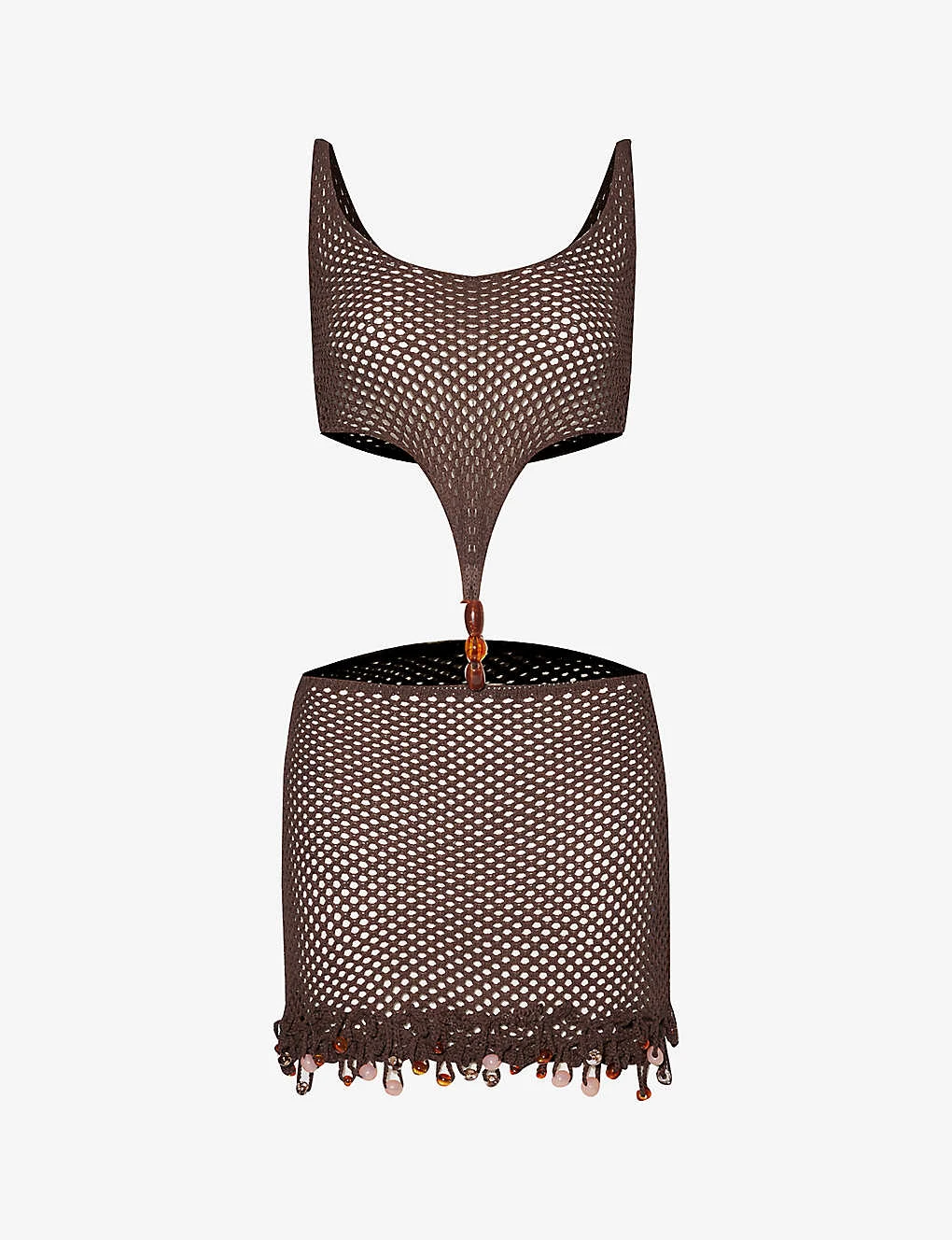 - Regular fit, scoop neck, shoulder straps, beads embellishment at front, open at front and back, all over crochet pattern, beads embellishment at fringed hem
