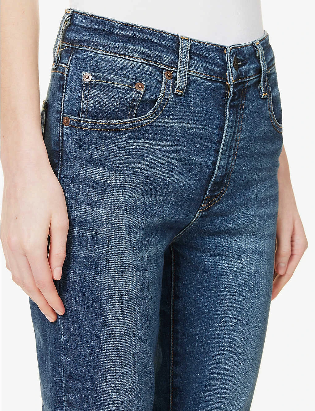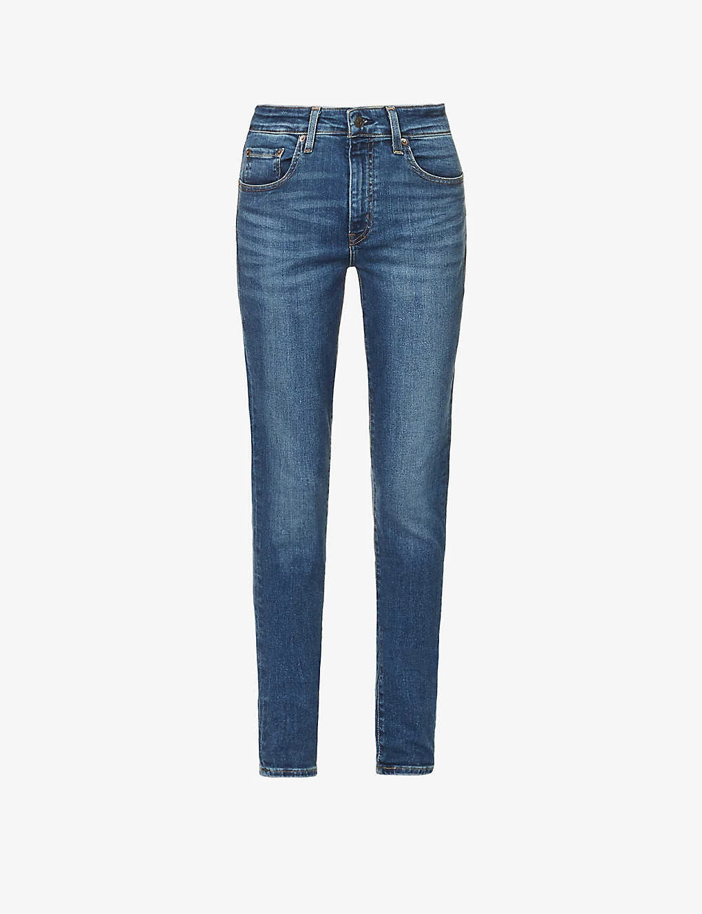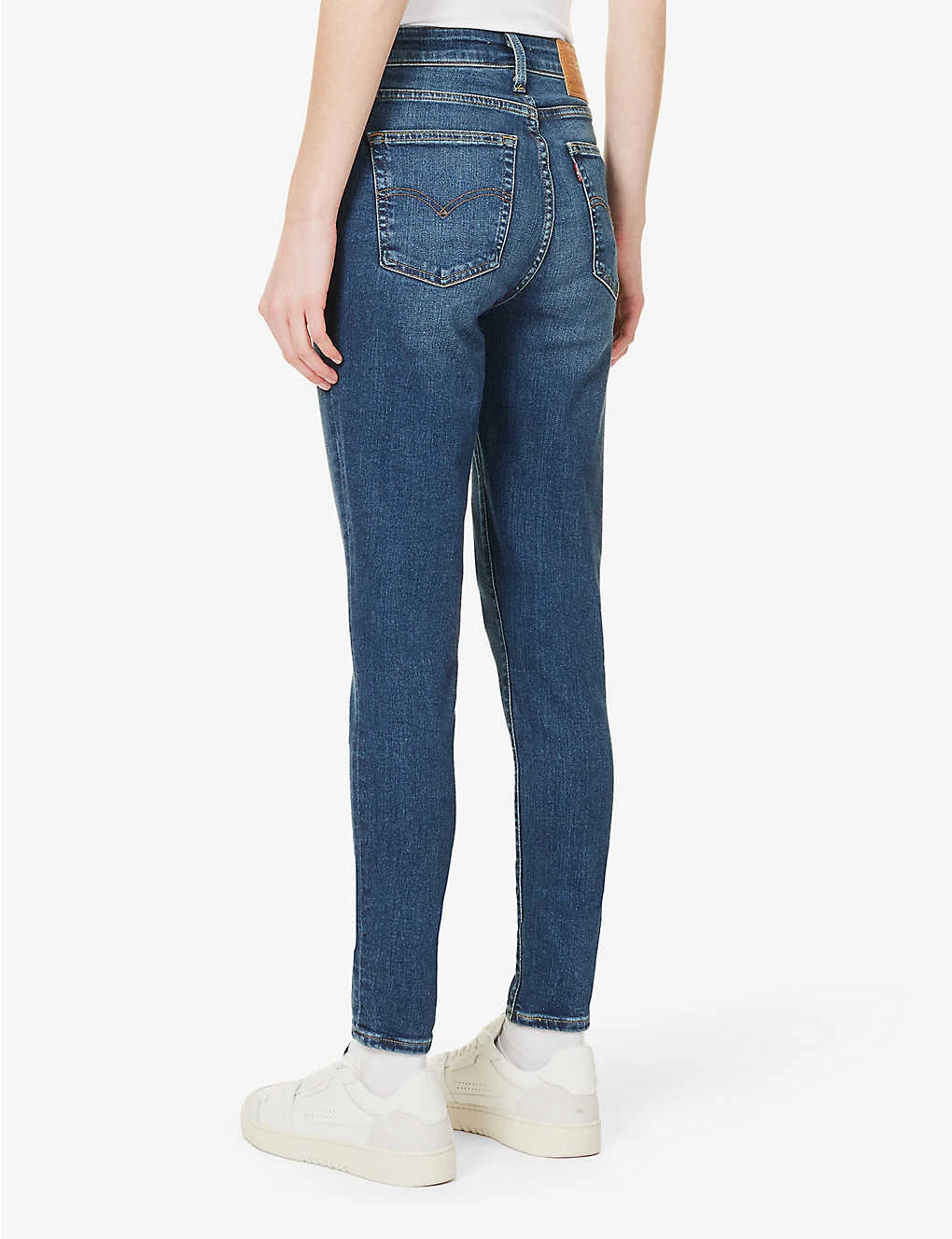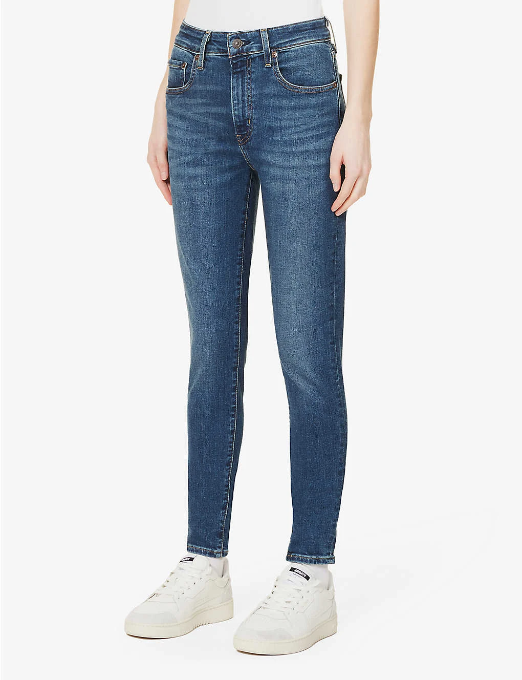 - Skinny fit, high rise, slim leg, structured waistband with belt loops, five pockets, curved yoke at back, brand embroidered tab at back, brand patch at back, mid-wash, contrast stitching, branded hardware