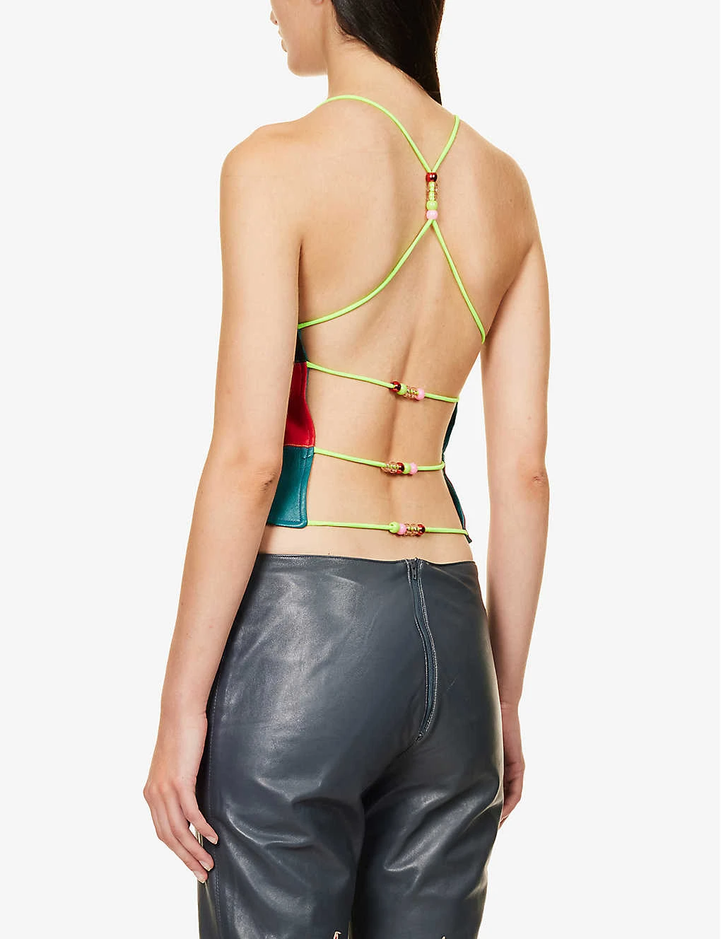- Slim fit, V-neckline, sleeveless, contrast panels, contrast straps with beads at back, cropped, handmade