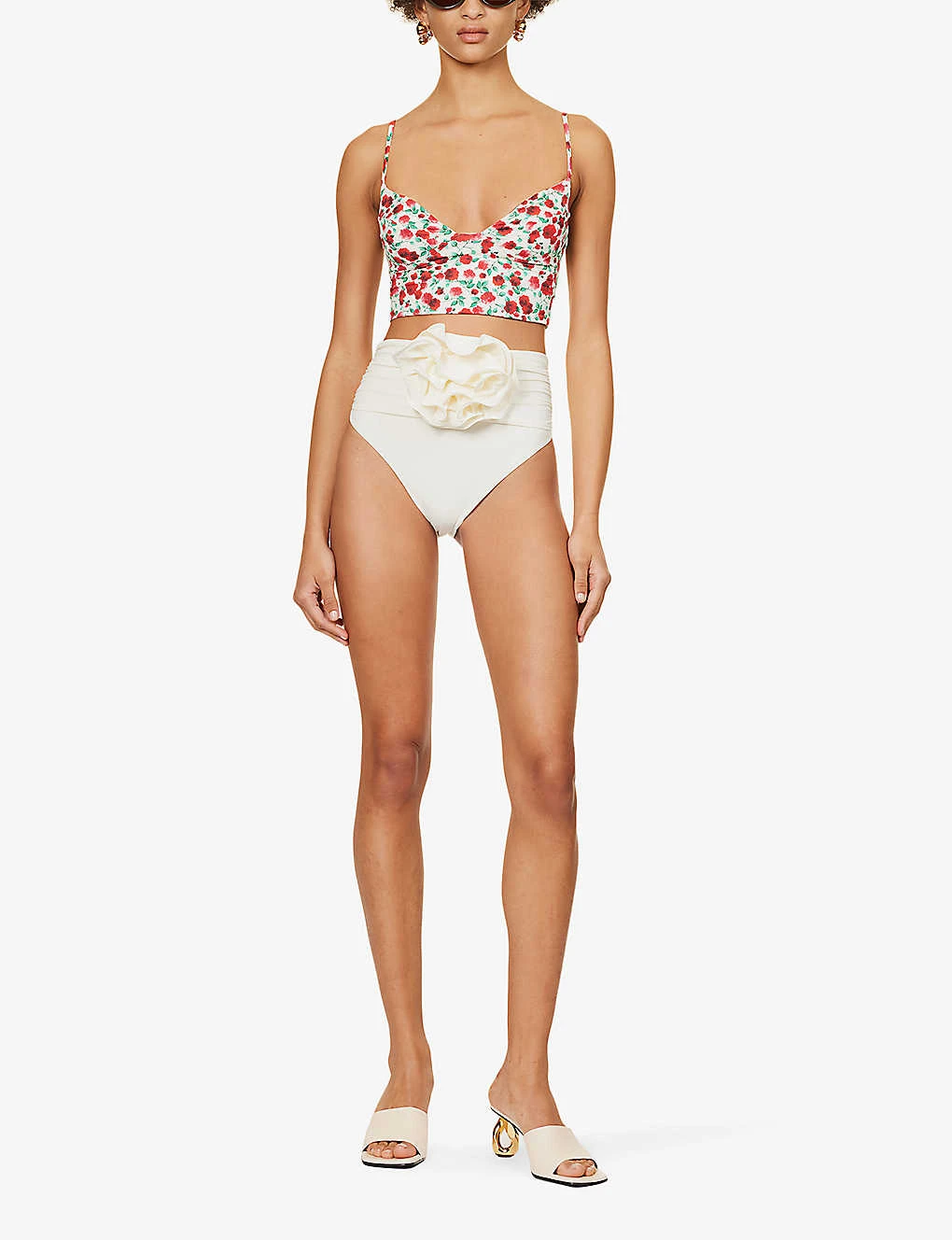 - High rise, elasticated waistband, detachable floral piece, ruched waist, high leg
