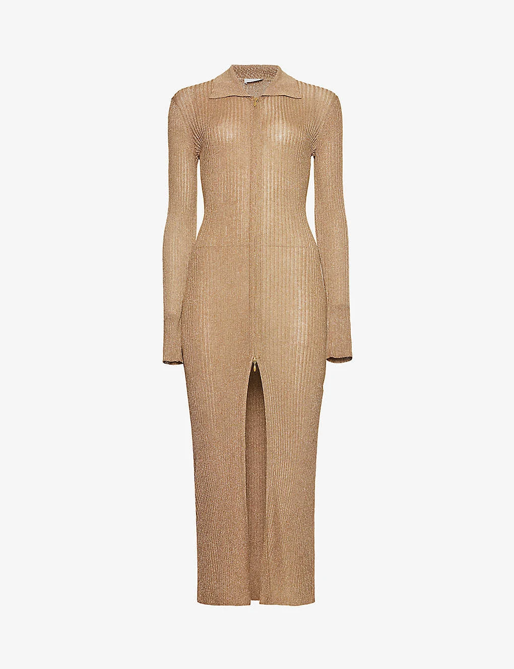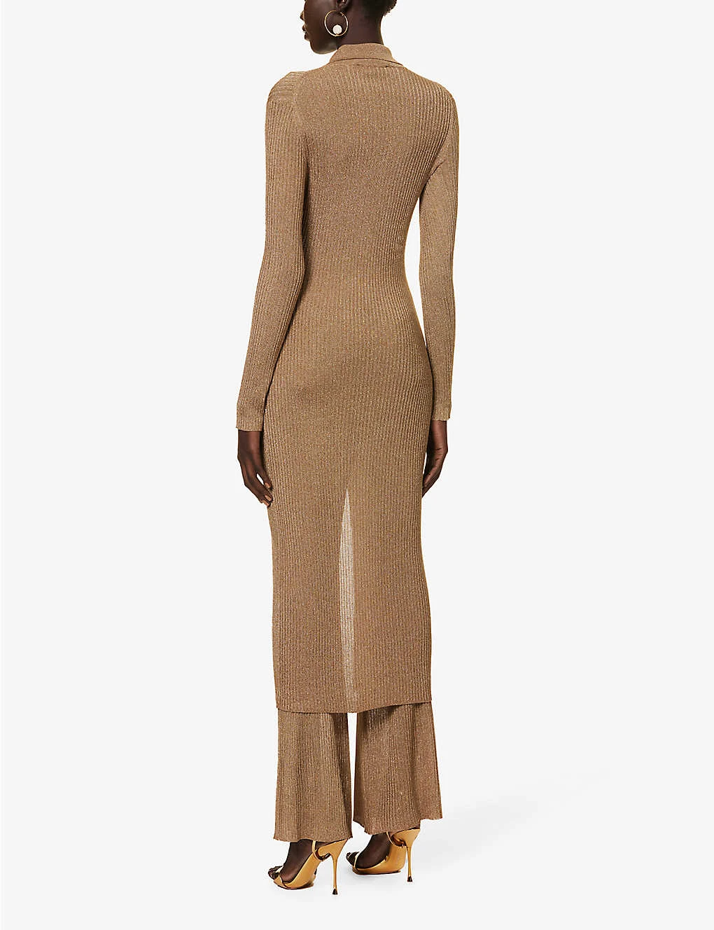 - Regular-fit, collar, round neck, long sleeves, all-over ribbed knit and metallic weave, fine knit