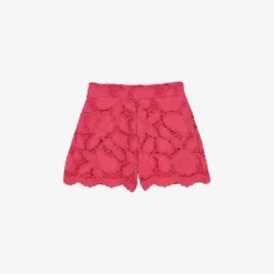 - Fitted waistband, two slip pockets at sides, all-over open work paisley embroidery, scalloped hem