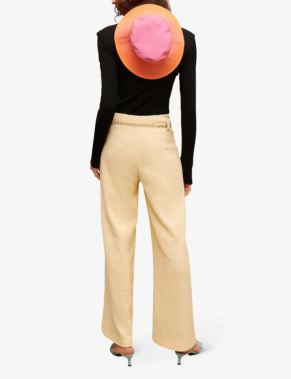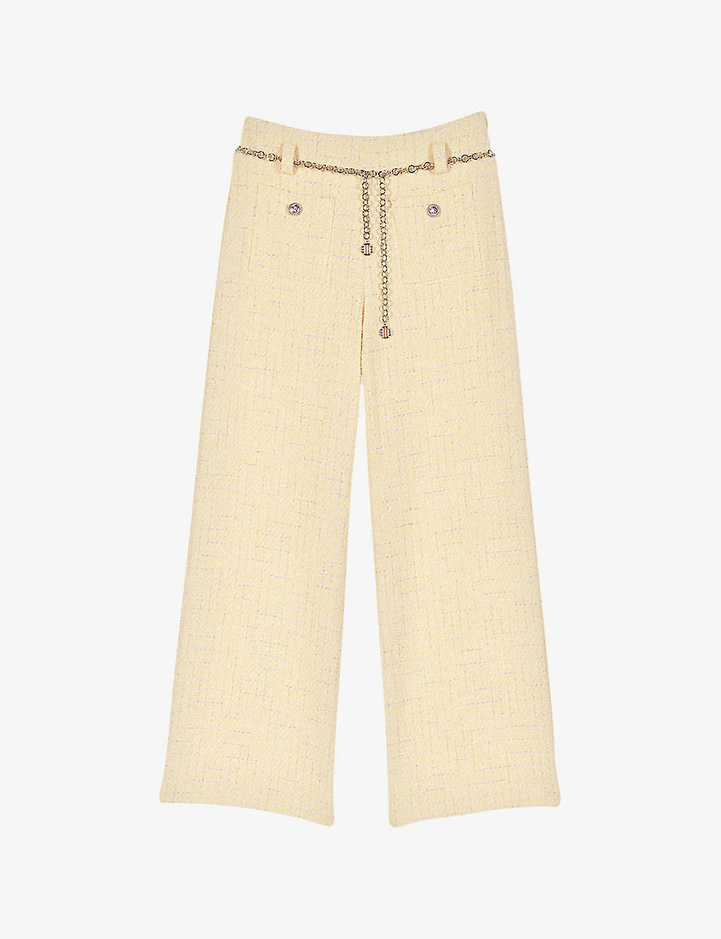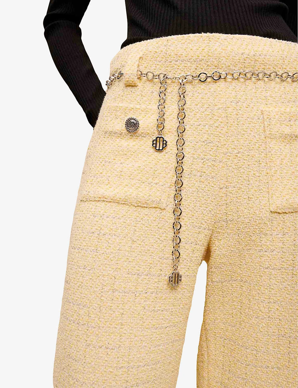 Loose-fit, mid-rise, wide-leg, belt loops, two patch pockets at front, all-over metallic-tweed texture, removable chain belt