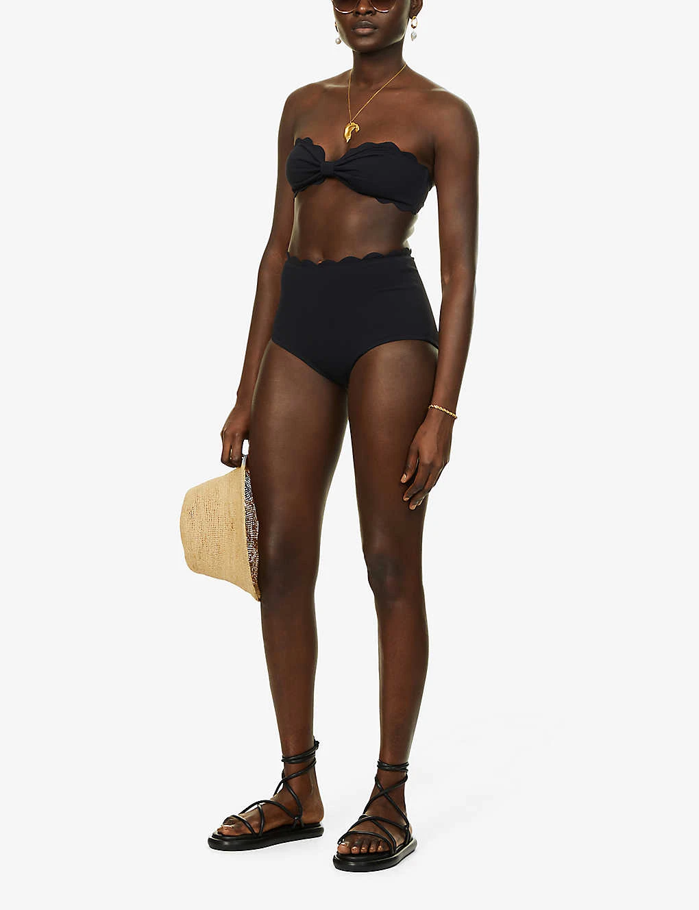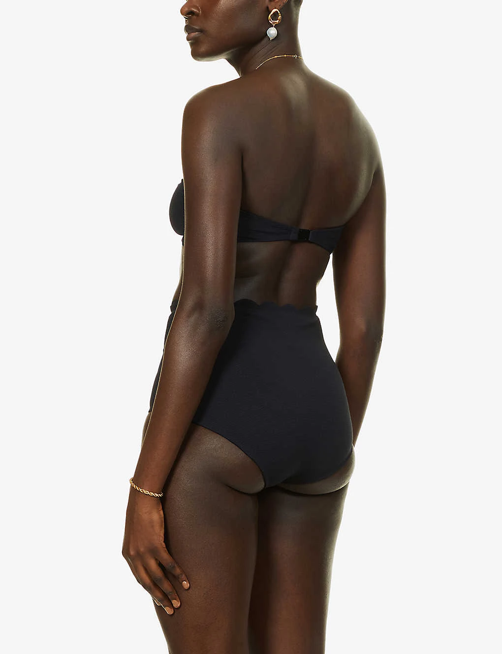 - Strapless, bandeau silhouette, interior boning at sides, gathered at front, scalloped trims