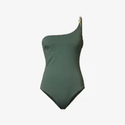 - Slim fit, stones embellishment at one-shoulder strap, darts at front, bodice structure at sides, fully lined, high leg, medium coverage at back