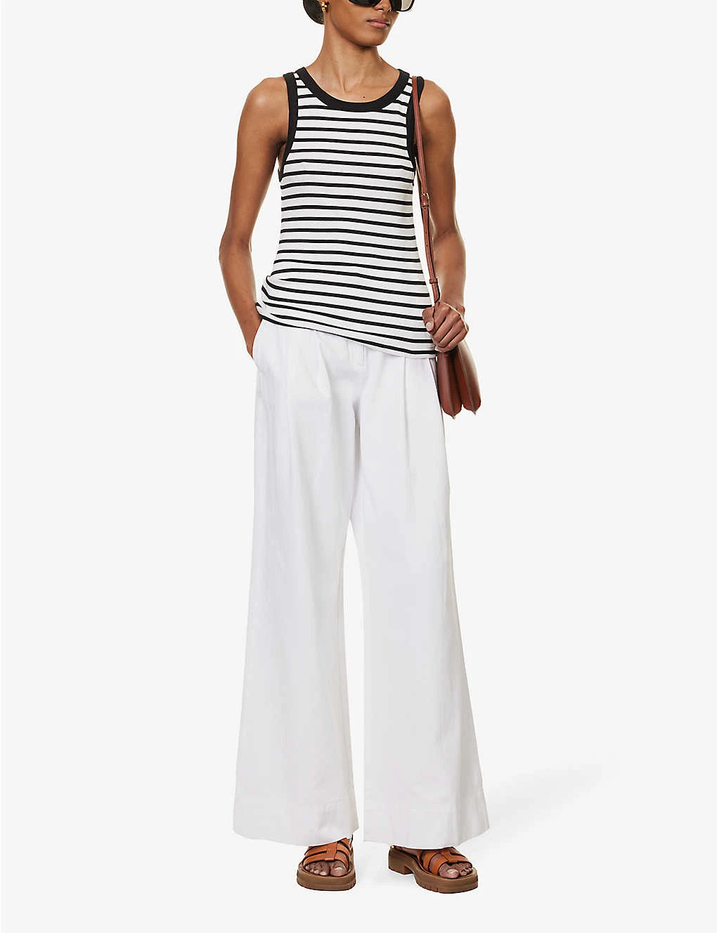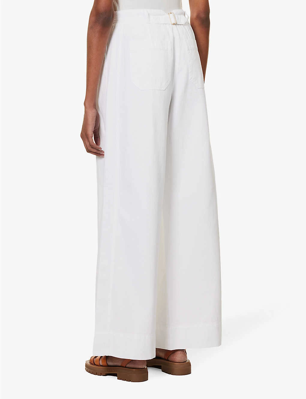 - Regular fit, mid-rise, straight wide leg, structured waistband with belt loops, two slip pockets at front, pleats at front, waist adjuster at back, darts at back, two patch pockets at back, gold-toned hardware