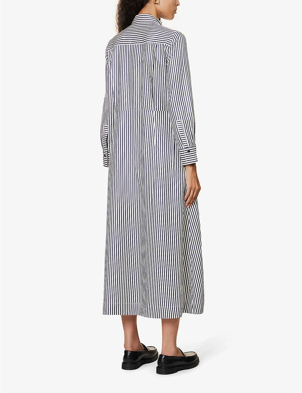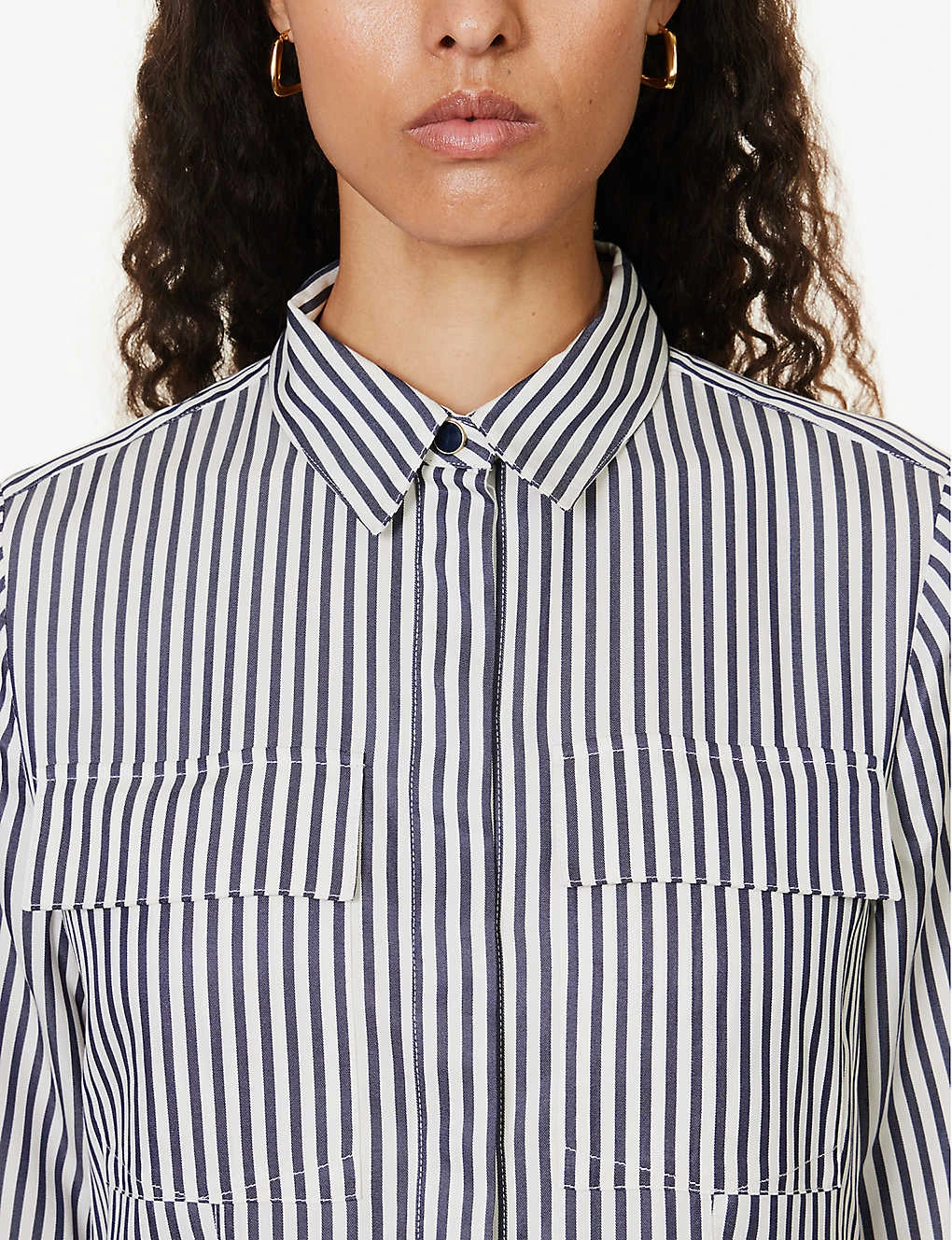 - Regular fit, collar, long sleeves, buttoned sleeve hems, two flap pockets at chest, two slip pockets at front, straight yoke with double pleat at back, all-over stripe pattern, flared hem