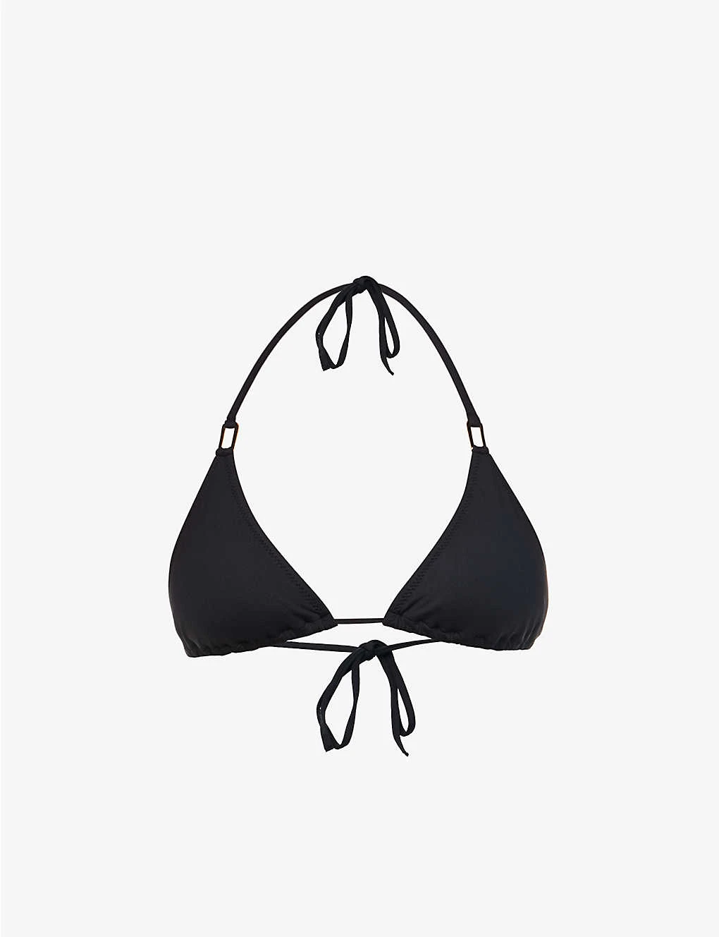 - Halter-neck, soft-triangle cups, detachable padding, gold-toned hardware, link embellishments at straps, lined
