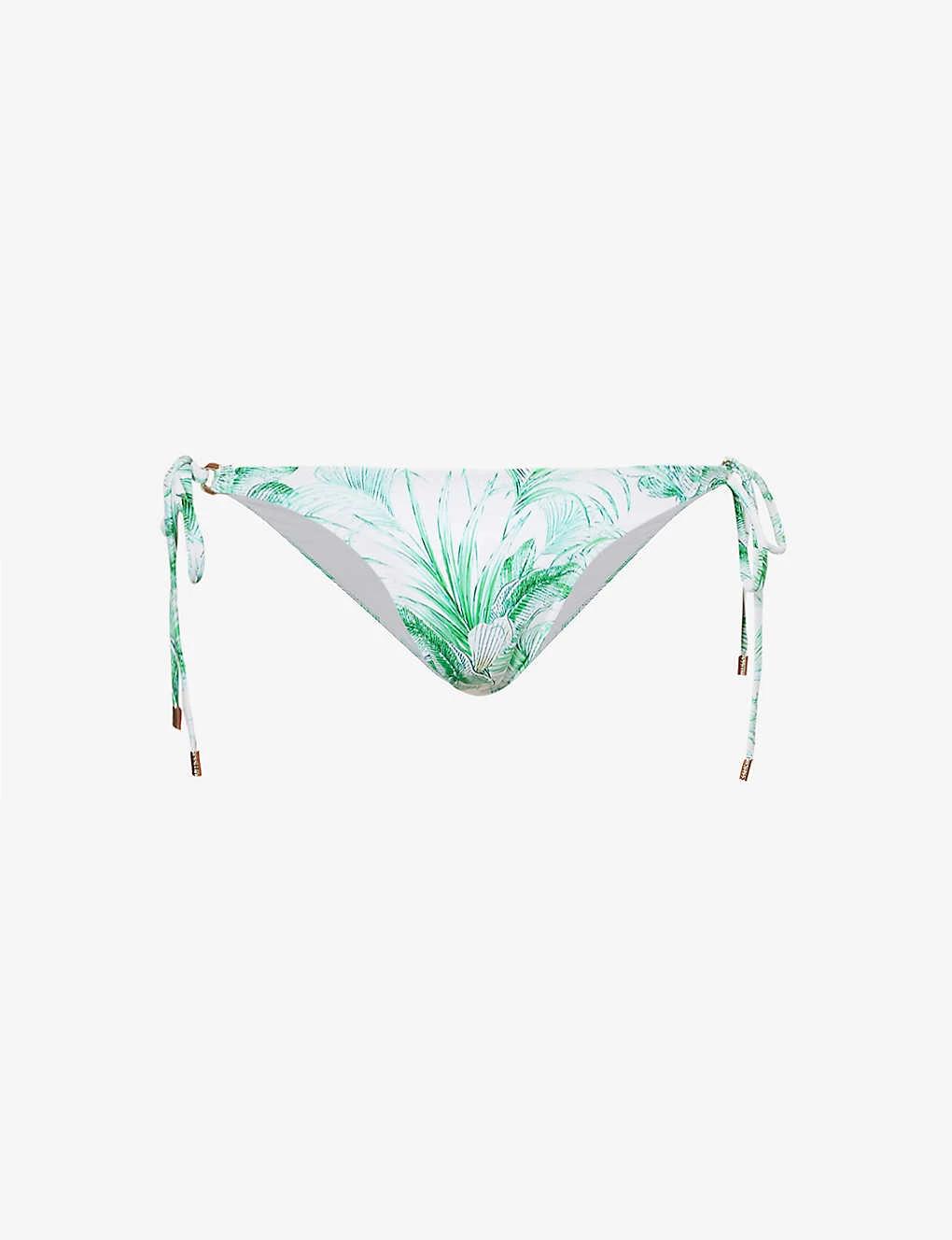 - Mid-rise, self-tie straps at sides, gold-toned branded hardware, all-over graphic pattern, medium coverage at back, lined gusset