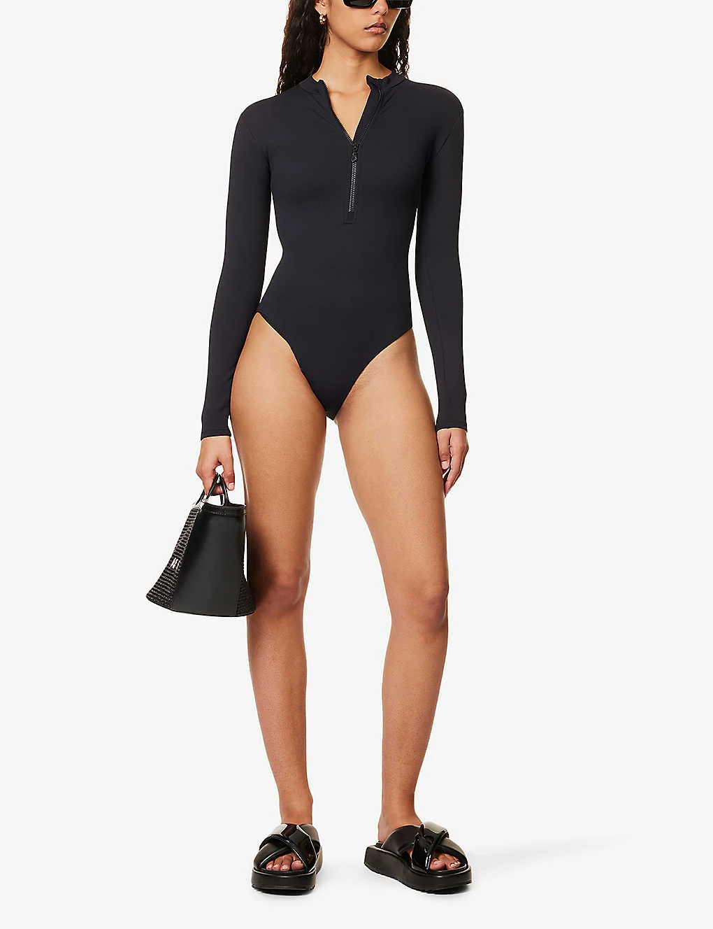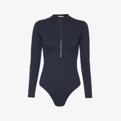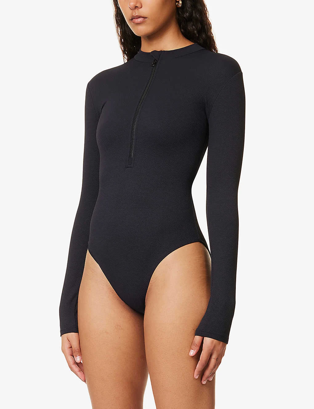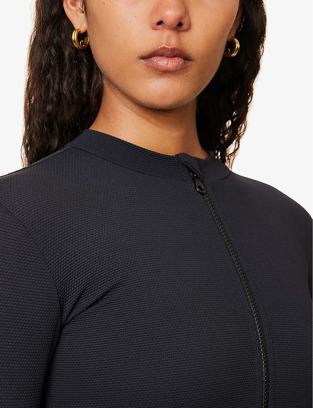 - Regular-fit, high neck, long sleeves, all-over piqué texture, mid-coverage at back