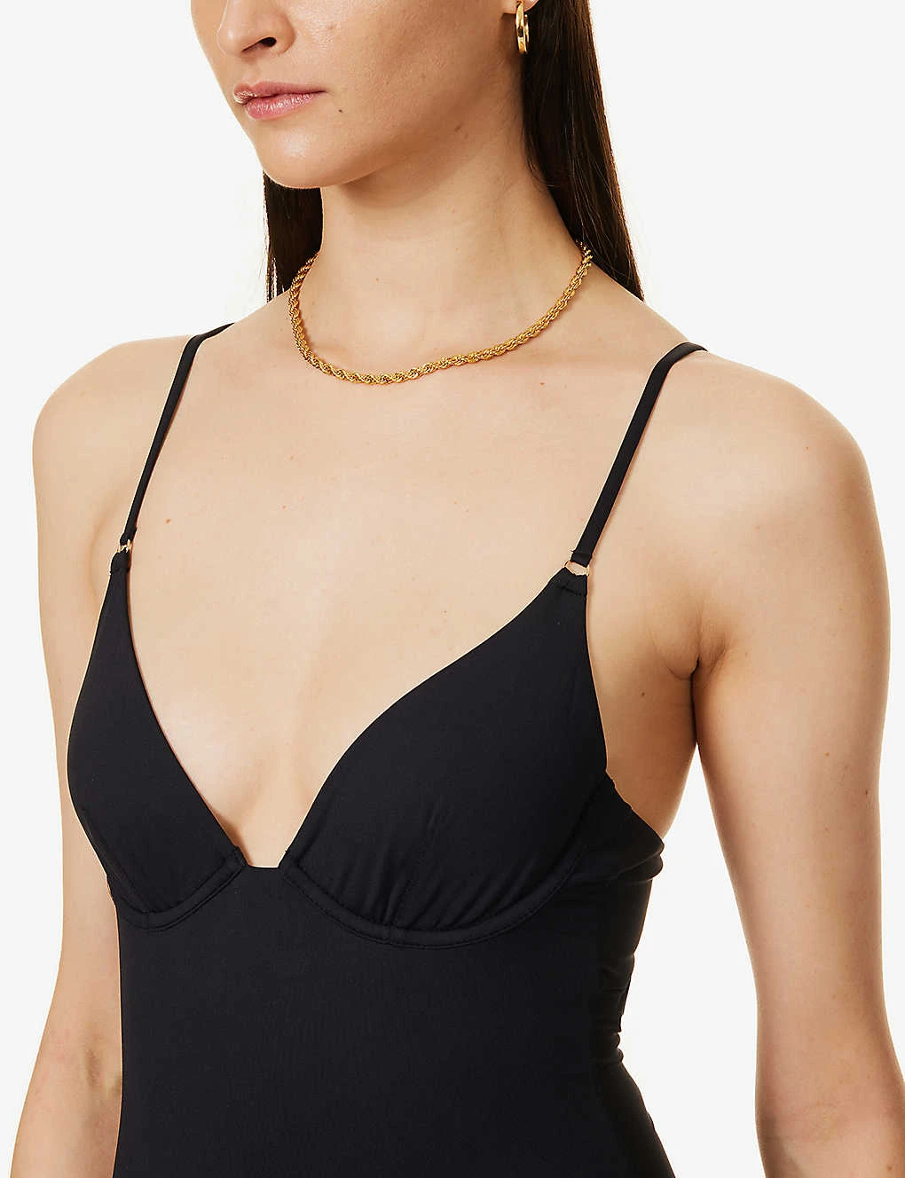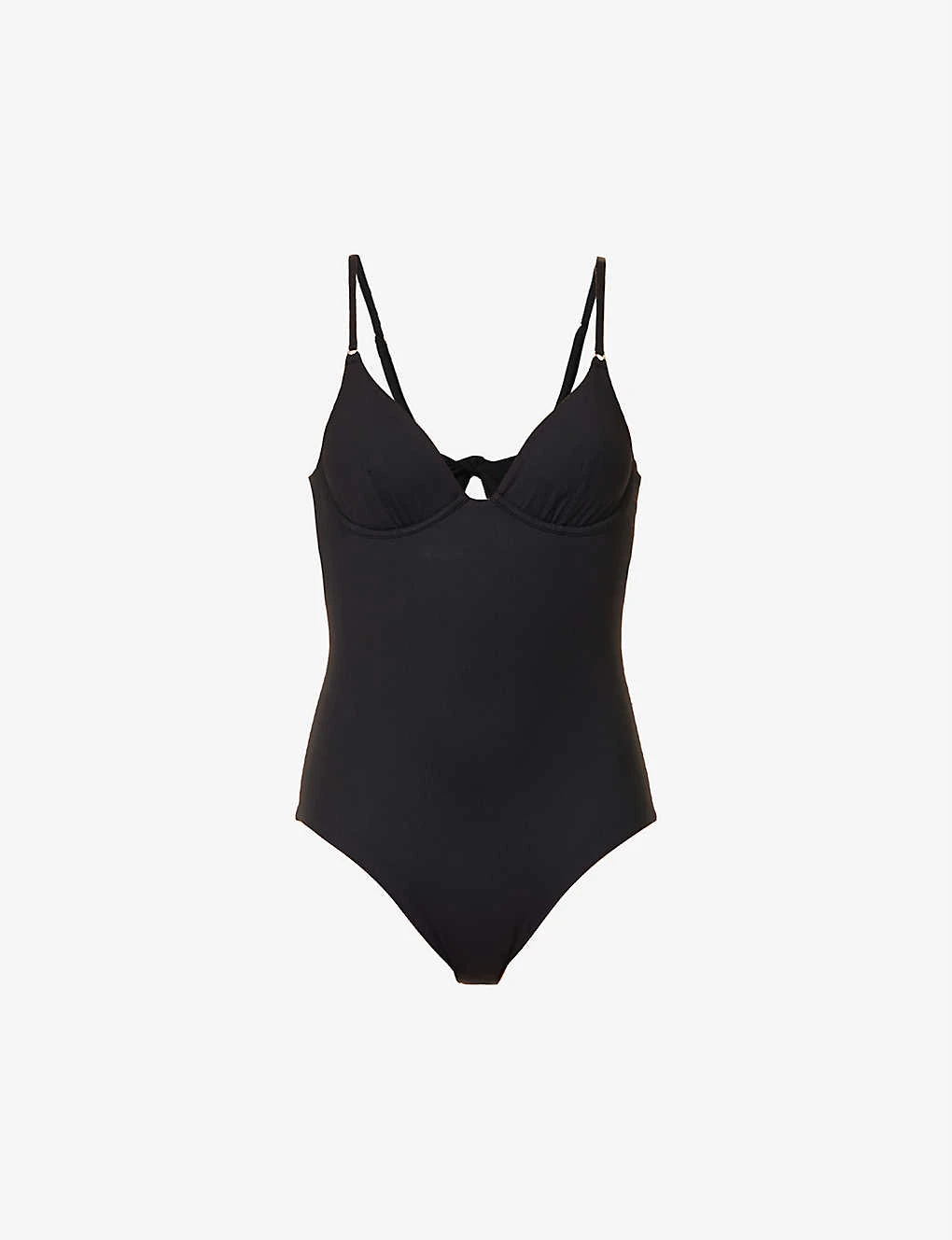 - Slim fit, plunge half-cups, underwired, sleeveless, adjustable straps, high leg, mid-coverage at back