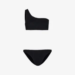 Hunza G bikiniDetails:Top:Straight-across necklineOne shoulder strapAll-over textured patternSlips onBottoms:Mid riseElasticated waistbandAll-over textured patternSlips onFabric:88% nylon, 12% elastaneMidweight, stretchySize & Fit:True to sizeCut to a regular fitCare:Hand wash