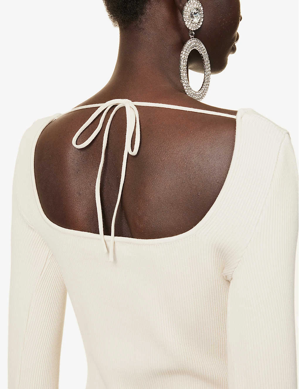 - Slim fit, square neckline, long flared sleeves, embellished rings at sleeve hems, medium knit, ribbed texture