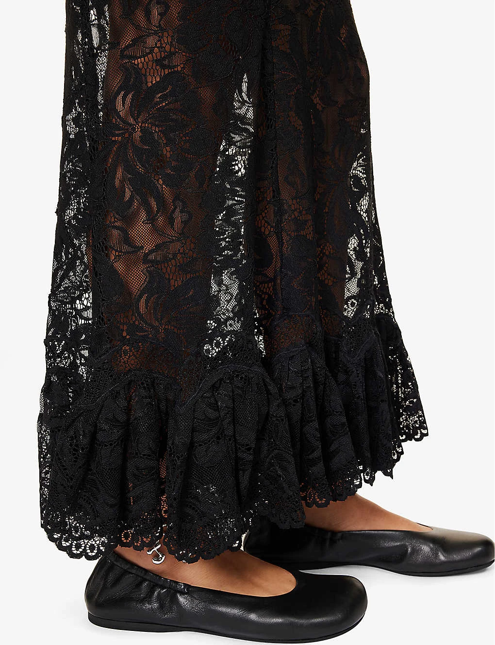 - Slim fit, mid-rise, structured waistband, floral lace pattern, semi-sheer, flared
