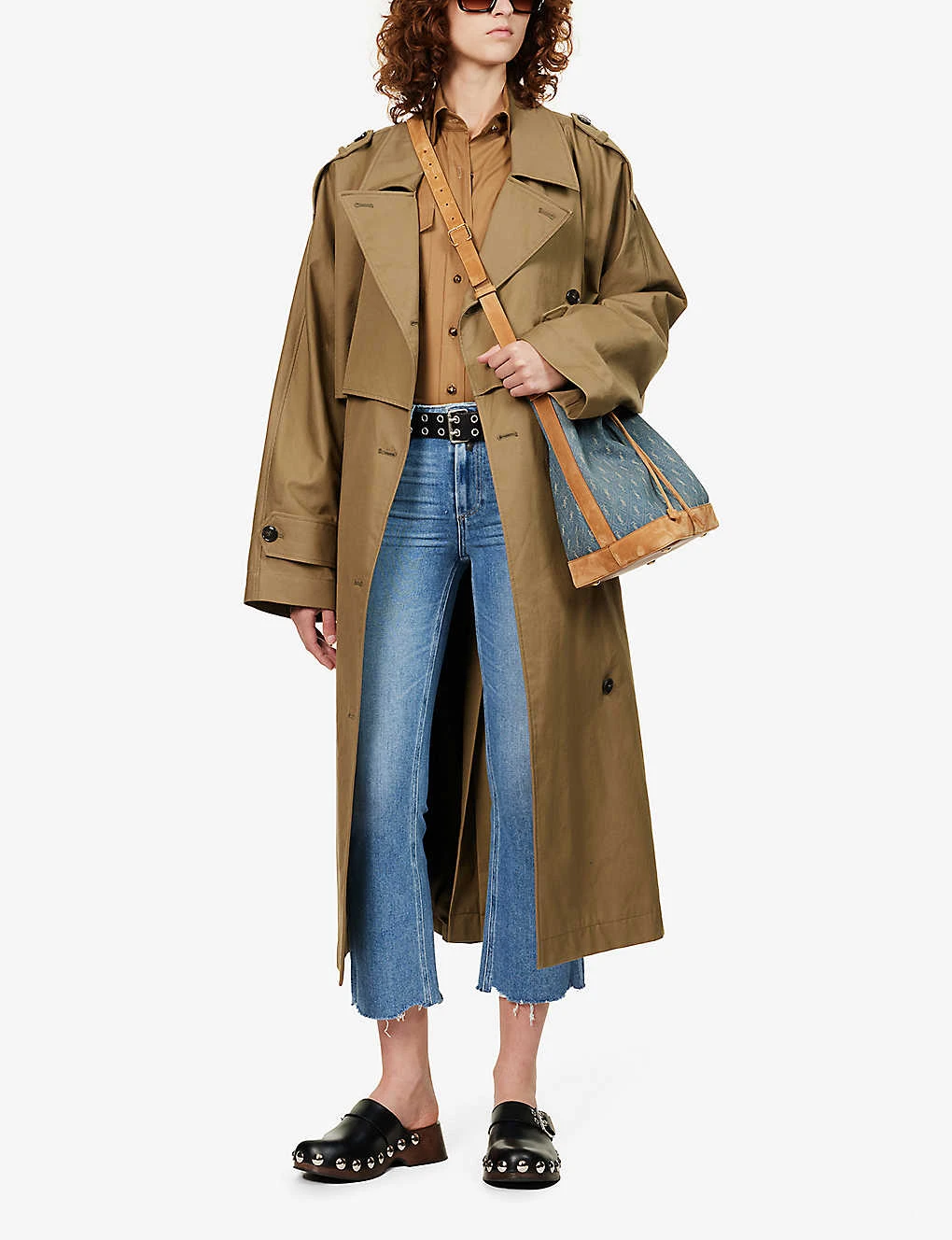 - Regular fit, high-rise, flare leg, cropped length, structured waistband, belt loops, five pockets, V-shaped yoke at back, brand patch at back, contrast stitching, light-faded wash, branded silver-toned hardware, distressed raw hems