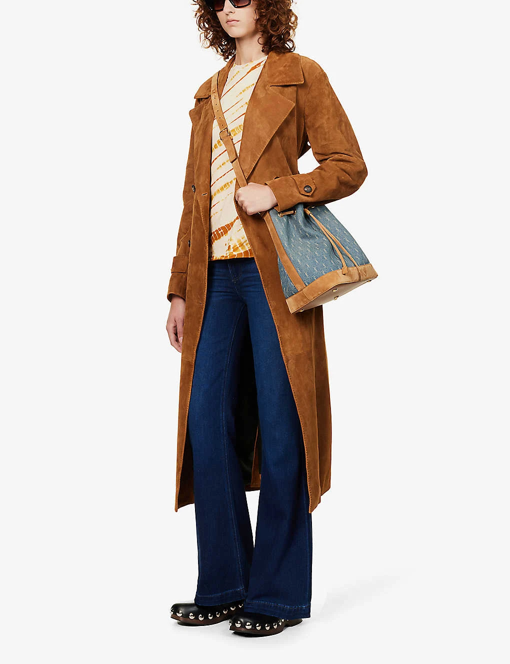 - Regular fit, high-rise, flare leg, structured waistband, belt loops, five pockets, V-shaped yoke at back, brand patch at back, contrast stitching, mid-wash, branded silver-toned hardware
