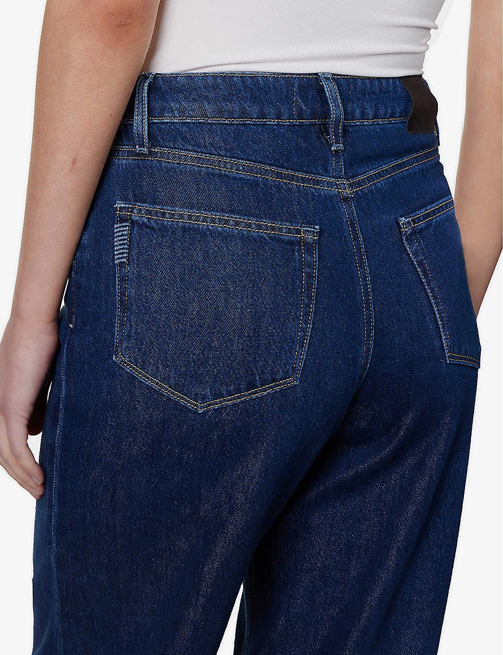 - Regular fit, high rise, wide leg, structured waistband with belt loops, five pockets, curved yoke at back, brand patch at back, contrast stitching, branded silver-toned hardware