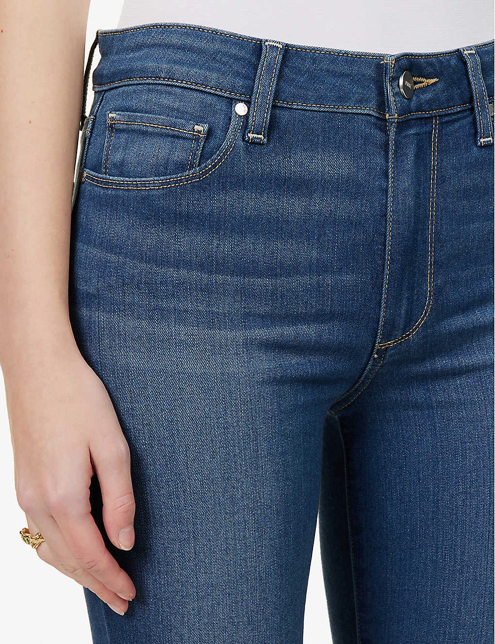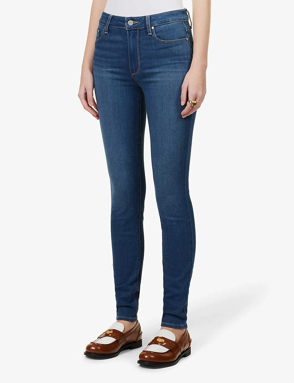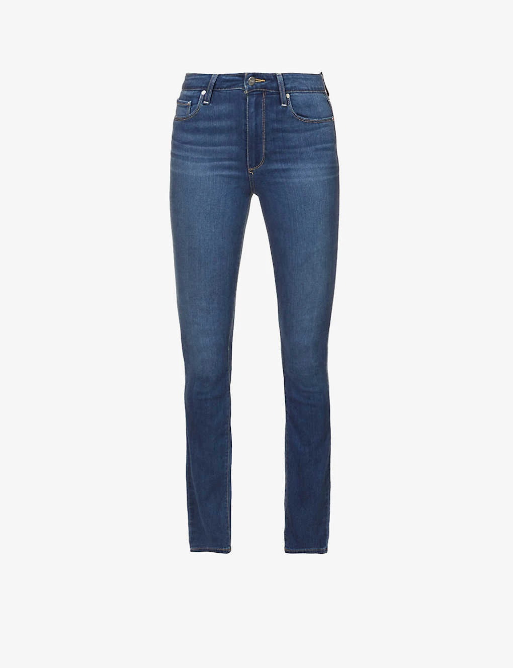 PAIGE stretch-denim jeans Exposed button and concealed zip-fly fastening at front Skinny, high-rise, subtle faded wash and whiskering, contrast stitching, belt loops, five pockets, branded hardware, branded leather patch at back waistband, v-shaped yoke at back 54% rayon, 23% cotton, 22% polyester, 1% elastane Machine wash True to size Size 27: Rise 10″”, inside leg 28″”, leg opening 9″” Model is 5ft 10″” and wears a size 27 Made in USA